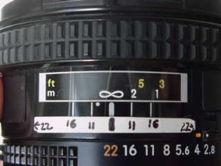 Recommendations top Intro Specs Performance Compared Recommendations The new 20mm f/1.8G is far better optically. I used to use this AF 20mm all the time because it's small and easy to use. I'd rather tote it around instead of the fat $1,500 17-35mm AF-S. This lens is not quite as sharp as my old 20mm f/4 AI manual focus. It's not quite as good as the 17-35mm F/2.8 AF-S zoom, which may be a first zoom to be a tad sharper than a fixed lens. The zoom also has less light falloff at f/2.8. How about that! Here's a trick: Get all your filters in 77mm size. Get a step-up ring here to allow 77mm filters to fit on this 62mm threaded lens. Now not only can you use any filter without vignetting, you can even use two 77mm filters at the same time without vignetting. Even if one of those filters is an ordinary thick-mount polarizer I still get away with just a little darkening of the corners. I get sharp results handheld at 1/10 second. What's this odd depth-of-field scale all about? Depth-of-field scales are calculated by Nikon at the maximum limits of fuzziness people are likely to tolerate. They are not calculated to give you the sharpest possible result if you have a tripod. You might think that stopping all the way down gives the sharpest result, however it may not due to an effect called "diffraction." This effect is the same as squinting your eyes too much: it just gets fuzzier. To spare you a very long and mathematical story, just stick a little scale like this to your 20mm lens. Find the nearest and farthest points of your subject, and place them each an equal distance from the main focus index so that they each fall on an equal f/stop just as you would for the conventional DOF scale. Read the f/stop from this new scale, and set that as your aperture for the sharpest possible result considering both depth-of-field and the effects of diffraction. F/22 is indicated at the ends of the scale, somewhat beyond what the window displays. For instance, if you want everything from 3 feet to infinity in focus, set the lens to 6 feet and use f/11-1/3 or f/13. You don't need to worry about the fractions; either f/11 or f/16 will be fine.