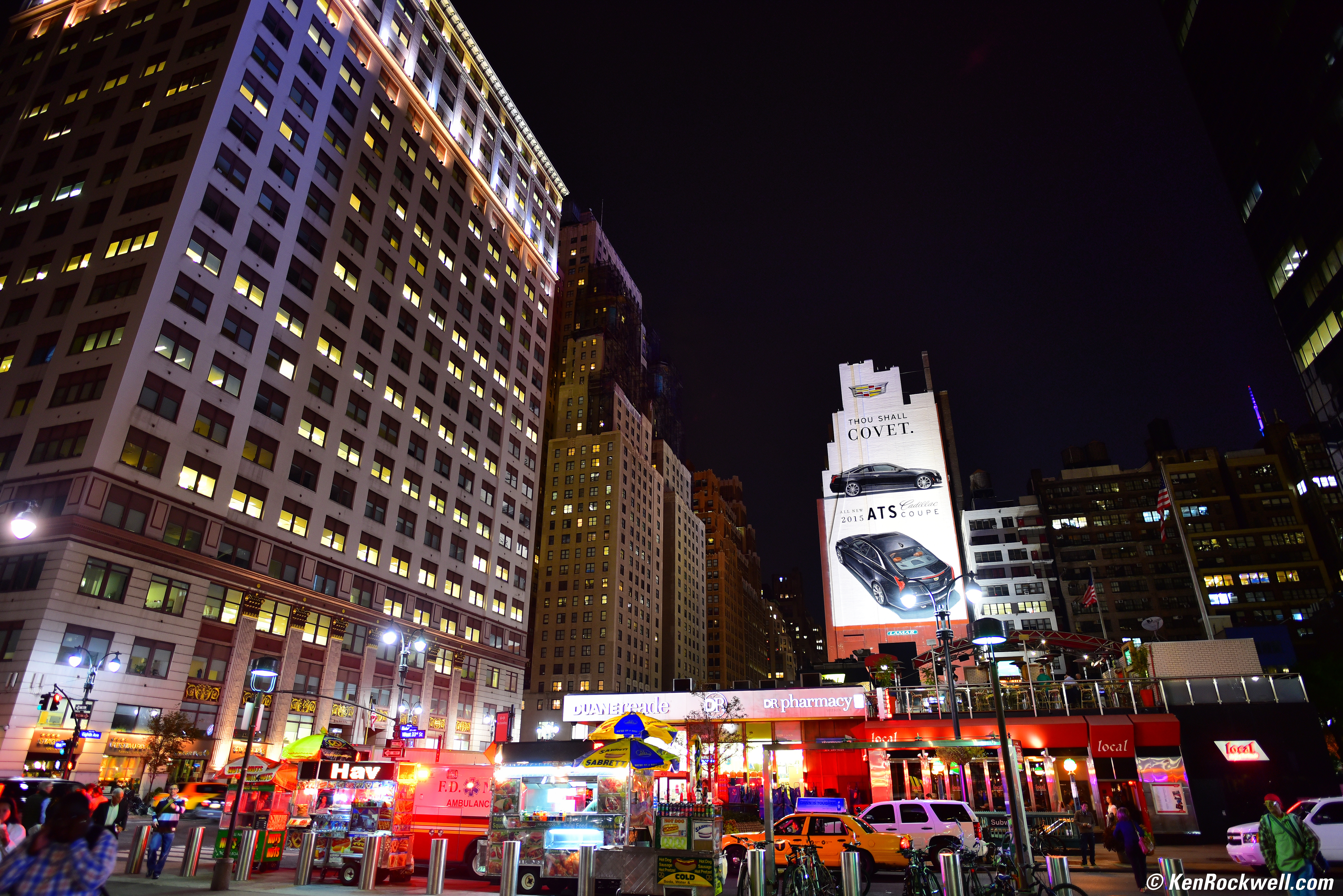 Outside Penn Station at night, New York City, 07 October 2014. D750, 20mm f/1.8, f/1.8 at 1/20 at Auto ISO 500, hand-held, Perfectly Clear. Full-resolution (10 MB JPG). Extremely sharp even at f/1.8! Introduction top Sample Images Intro Compatibility Specifications Performance Usage This new Nikon 20mm f/1.8 FX is Nikon's sharpest fixed ultrawide lens. Not only is it over a stop faster than any previous Nikon ultrawide lens or zoom, it's ultrasharp (even wide-open), it focuses super-close, has no ghosts, has great sunstars and only minimal distortion. You can read the rest of this review if you like, or just do as I did and get yours now and just start shooting. I can't find anything wrong with it; it even works great with two stacked filters with no vignetting on full-frame! It's ultrasharp, ultrafast, and small and light. Nikon hasn't updated the optical design of its other 20mm ultrawide lens in over 30 years since the original 20/2.8 AI-s lens of 1984, so this new 20/1.8 is a real eye opener in what Nikon has learned in 30 years. This new lens makes any old 20/2.8 look broken by comparison, especially at large apertures (the AF, AF-D and AI-s lenses all have the same optical design). You may turn the focus ring at any time for instant manual-focus override. I got my 20/1.8 at Adorama; I'd also get it at Amazon, at B&H or at Crutchfield or used at eBay if you know How to Win at eBay.