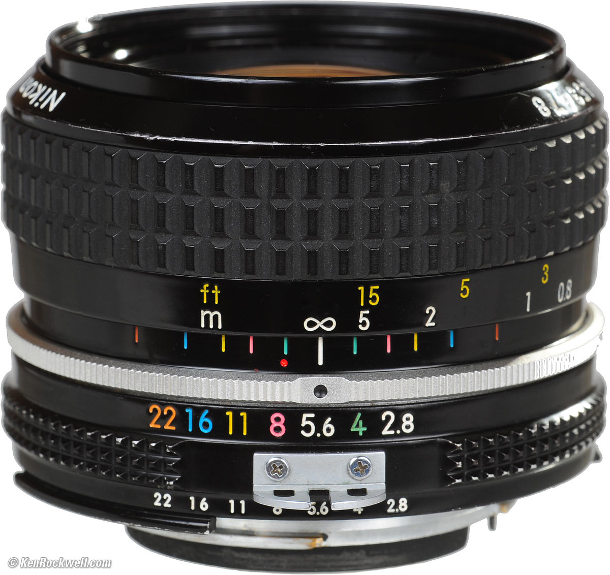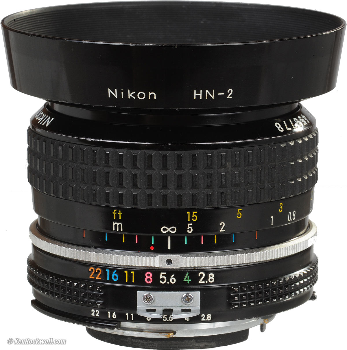 Mechanics back to Performance back to top Like all Nikkor manual focus AI lenses, the Nikon 28mm f/2.8 AI is built to the highest mechanical standards of any lens ever made. Barrel Exterior: Anodized and enameled aluminum. Filter Threads: Anodized aluminum. HN-2 Hood: Threaded anodized aluminum (optional). Focus Ring: Metal, rubber covered. Focus Helicoids: Feels like brass: smooth and silky with no play or need for damping grease. Depth-of-Field Scale: Engraved into barrel and filled with different colors of paint. Internals: Metal. Aperture Ring: Cast aluminum, anodized and enameled. Engraved markings filled with different colors of paint coded to the depth-of-field scale. Mount: Dull-chromed brass. Markings: Engraved into the metal and filled with paint. Identity and Serial Number: On the front of the focus ring, engraved into the metal and filled with paint. Oddly, both samples I've seen look like an identity ring fell off the inside of the filter ring. There is a shiny black, blank, flat ring between the glass and filter threads. Not to worry, this is the way the lens is supposed to be. Ass-Gasket (dust seal at mount): No. Noises When Shaken: Mild clicking from the diaphragm blades and actuation system. Made in: Japan.