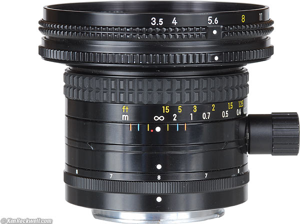 Movements back to Performance back to Top You have two: a worm-gear driven shift, and click-stopped 360 degrees of continuous rotation just like that kid's head in The Exorcist. You rotate the whole lens to put the shift direction where you want it. You can't adjust the shift through zero because it stops at zero. The 24mm PC-E by comparison only rotates 180 degrees, but allows continuous shift above and below zero. The 24mm PC-E is more like a view camera, but neither is much easier to set up. The movements feel perfect, and the worm gear drive allows perfect, precise framing. Tilts and Swings (what are tilts and swings?) The 28mm PC has no tilts and no swings. Unlike the 24mm PC-E, this classic 28 PC can't do anything to help focus.
