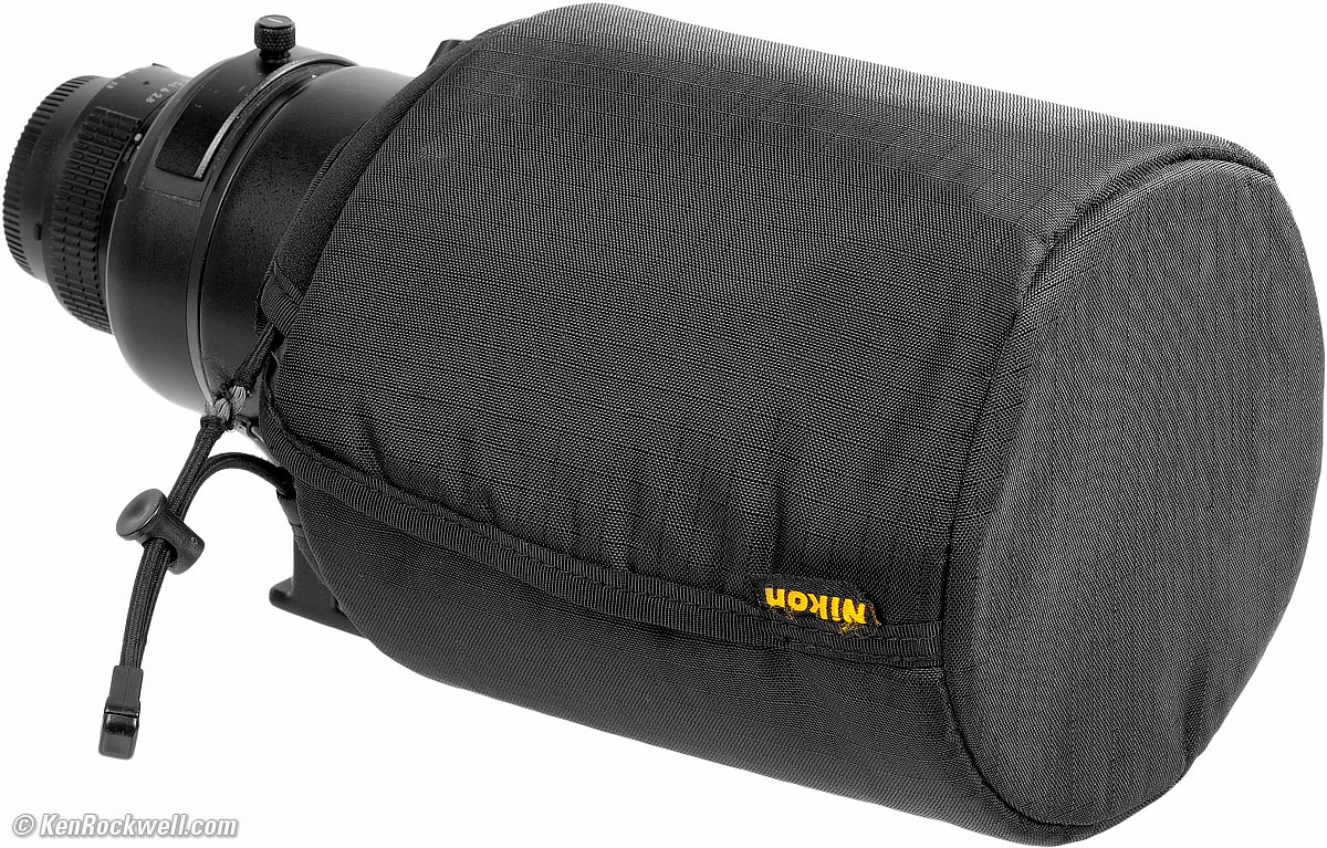 Caps top The front cap is a padded nylon cover with a drawstring. If covers the hood in either the extended or reversed position. It weighs 4.560 oz.(129.3g). Nikon 300mm f/2.8 AF-S II with soft padded cap. enlarge.
