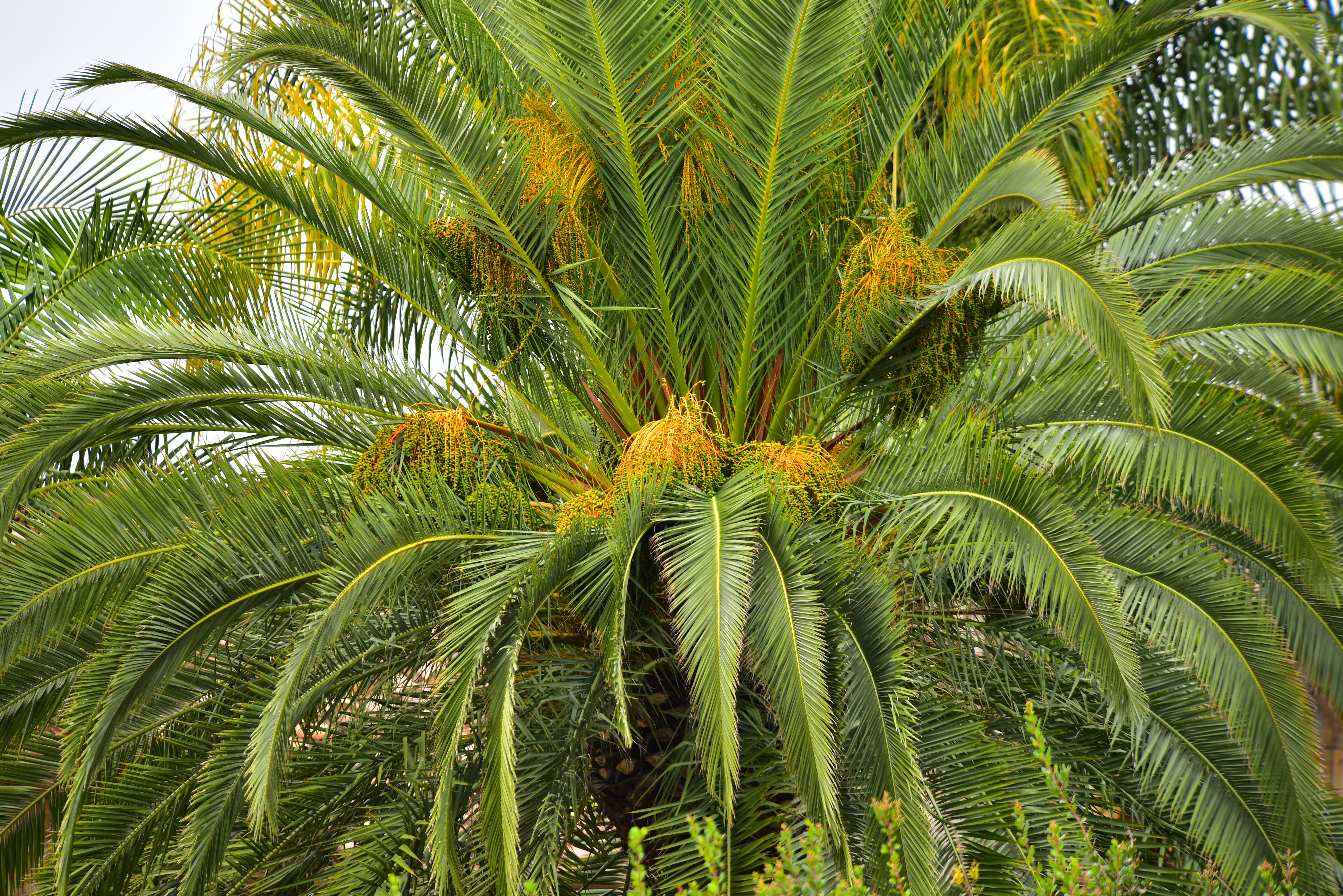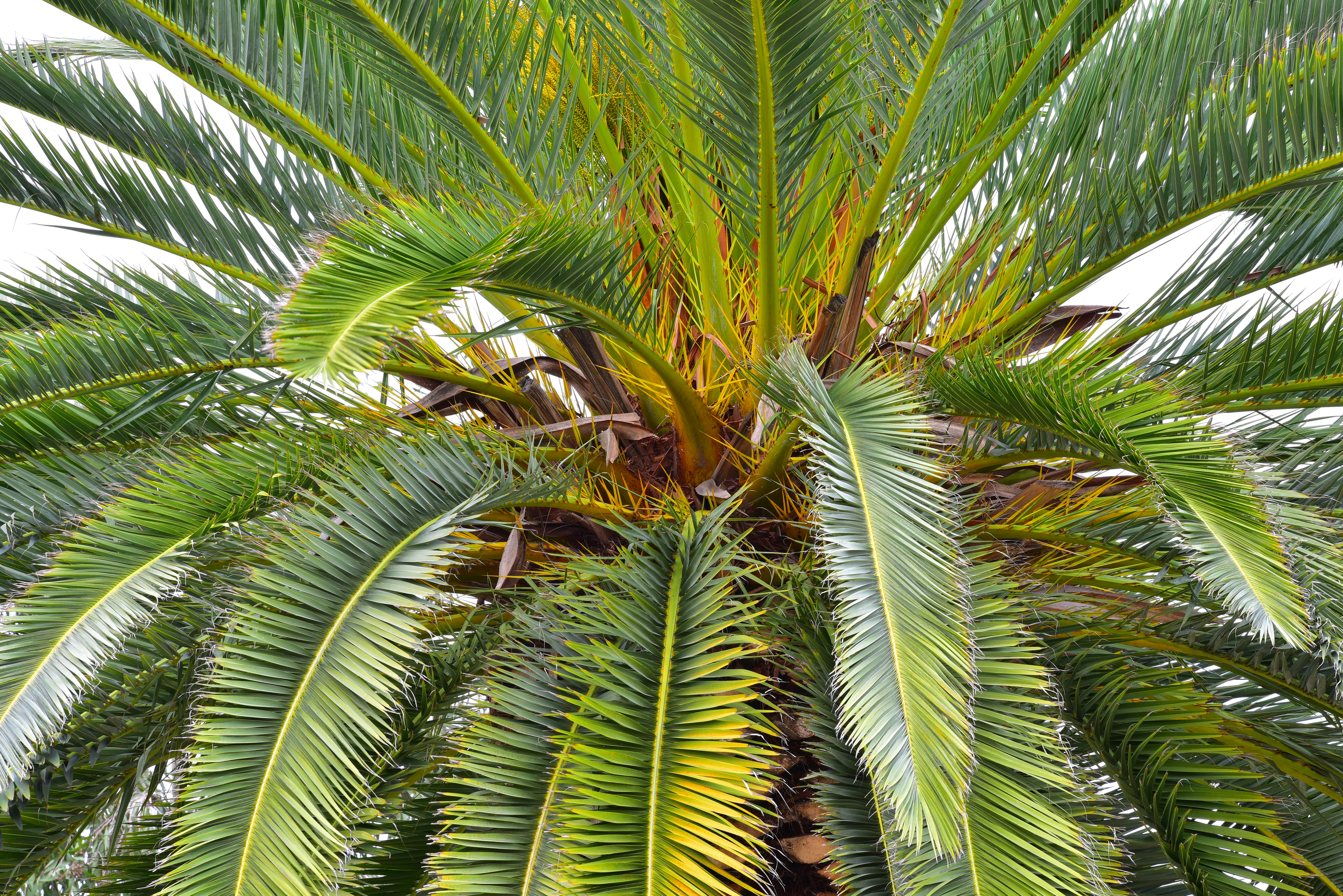 Palm at f/16, overcast, 16 December 2014. Nikon D810 at ISO 100, f/2.8 at 1/125. Camera-original file. Even at f/16, only the center is in perfect focus.