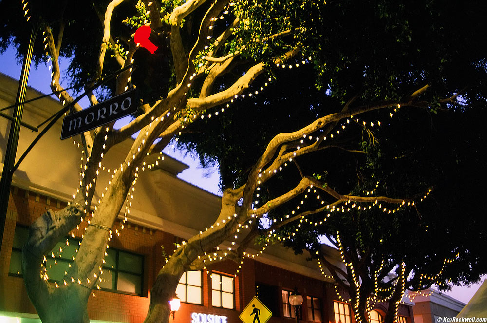 Colorful Intersection in Twilight, 5:49 PM. Nikon D810, Nikon 35mm f/1.4 NIKKOR AI-s, f/1.4 at 1/40 at Auto ISO 1,000. The dot in the sky is a planet rising. bigger.