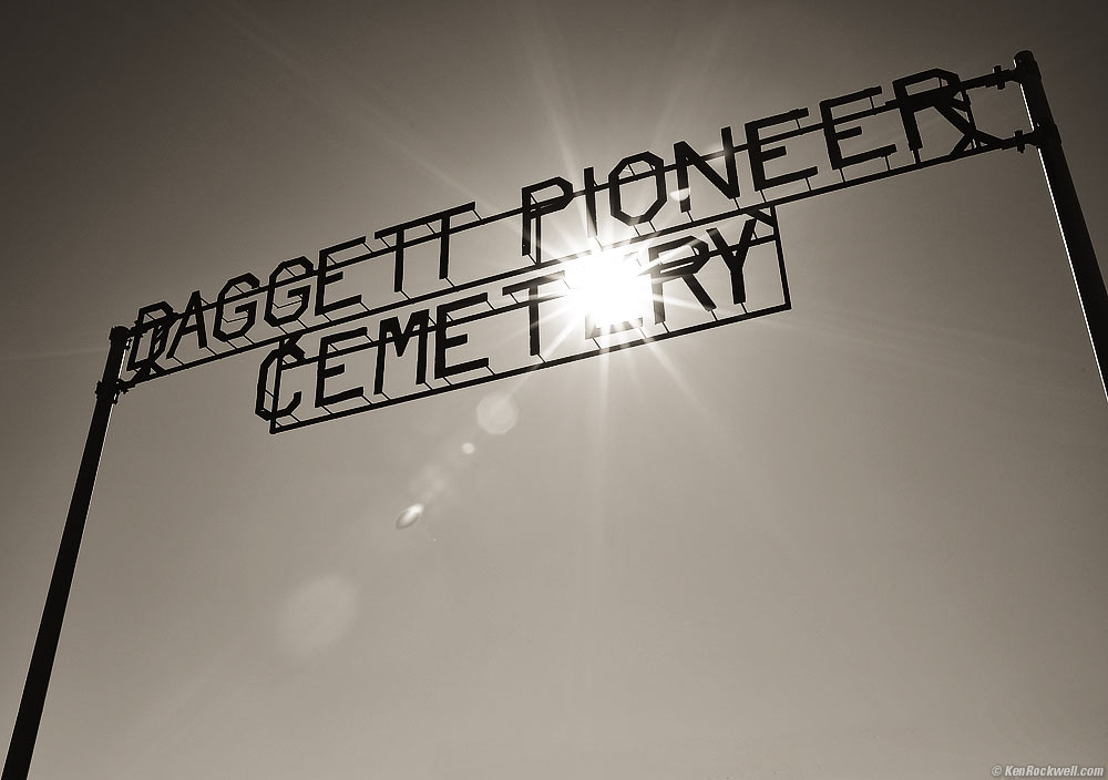 <Sun Shining Through Daggett Pioneer Cemetery Sign, 10:56 AM, 07 February 2015.Nikon D810, Nikon 35mm f/1.4 NIKKOR AI-s, f/16 (for big sunstars) at 1/60 at Auto ISO 100, split-toned print. bigger.