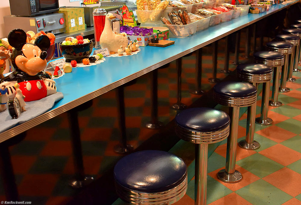 Counter and Stools at Peggy Sue's Restaurant, Yermo, 6:47 PM, 07 February 2015. Nikon D810, Nikon 35mm f/1.4 NIKKOR AI-s, f/5.6 at 1/20 hand-held at Auto ISO 1,400. I flipped the negative in Photoshop so the picture reads properly from left to right. bigger.