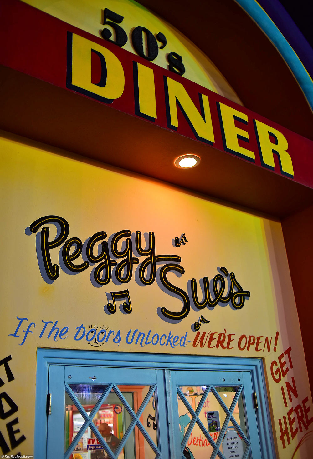 Front Door at Night, Peggy Sue's Restaurant, Yermo, 8:19 PM, 07 February 2015. Nikon D810, Nikon 35mm f/1.4 NIKKOR AI-s, f/2 at 1/20 hand-held at Auto ISO 320. bigger.