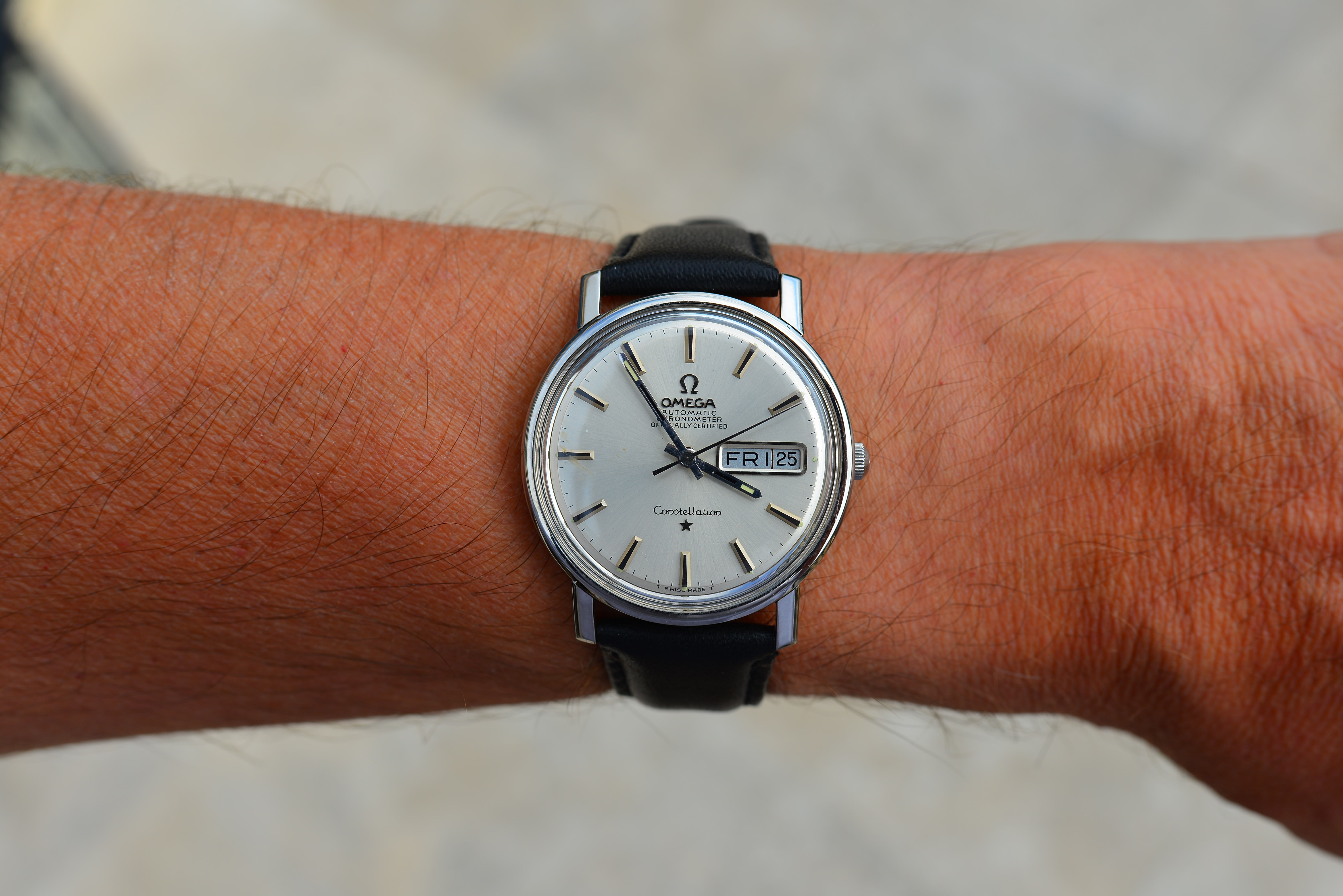 Macro performance top Omega Constellation at close-focus distance on full-frame. © 24MP Camera-original file.
