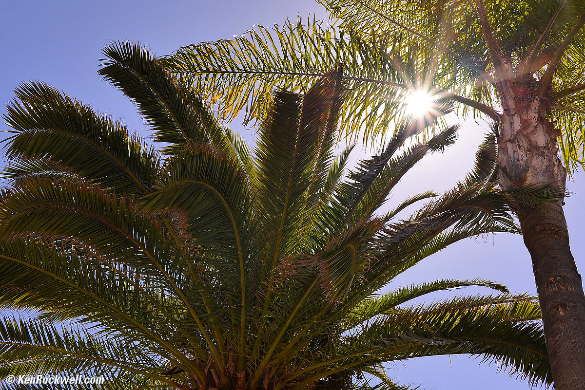 Ghosts performance top Nikon 35 1.8 FX at f/9. bigger. There are no ghosts or flare under any reasonable condition. If you go out of your way to put the brilliant summer sun in your image and put a dark shadow on the other side to look for ghosts, you still won't get anything. In this shot, I'm staring directly into the summer sun and adding one stop exposure compensation, and then lightening the palm, and still no ghosts.
