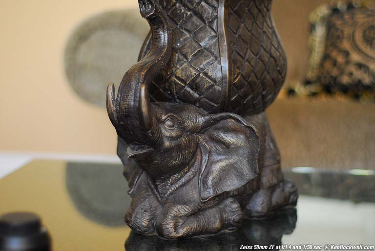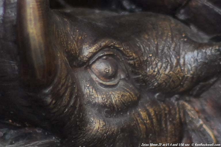 Index of individual test pages VR versus Fast Apertures Which is sharper: a fast shutter speed from a fast aperture like f/1.4, or a longer shutter speed and VR? VR in the 18 - 200mm VR claims a 3 - 4 stop advantage, which is exactly the advantage of f/1.4 over the f/4.8 of the VR lens at 50mm. VR is of no help if your subjects are moving. Go for the faster lens. What if you have a still subject and no tripod? Will the added depth-of-field of the slower lens add sharpness lost with the larger aperture? The only way to see is to make some shots. Here is a full frame from the Zeiss f/1.4 at f/1.4 and 1/50 second, the slowest suggested speed from the old wives' tales with a 50mm lens. I also shot the same thing with the 18 - 200mm VR at 50mm, at 1/5 of a second.1/50 at f/1.4 is the same exposure as 1/5 at f/4.8. Roll your mouse over to see the result with the VR lens. Full frame comparison (roll mouse over image to see other lens) 100% crop comparison (roll mouse over image to see other lens) ANALYSIS The VR looks much better to me due to deeper depth of field and much better contrast. VR worked to get sharp shots at 1/5 of a second. I shot each at the slowest speed at which I could get decent results. I usually fire three rounds per burst in low light, but gave it five per lens to get a really sharp one. This technique comes from the fact that camera shake is a random event. Make enough shots if you're on the verge of shake and you'll get a sharp one. I usually fire three rounds and cherry-pick when shutter speeds get low. I leave my fire selector in AUTO, or Cs. Press once for one shot, hold for more. It's easy to sort out later, if you have the right software. This process, best of five, is much fairer than making one shot each and hoping for the best. Shake is random, and this process gives me the most accurate representation of repeatable results in the field. I got results with no motion blur for both lenses, hooray! The differences I do see are the static results I would expect. The VR lens has better image quality wide open than any of the f/1.4 lenses. Every f/1.4 lens has a lot of veiling haze from spherical aberration. This lowers the contrast significantly. The VR is fairly sharp and very contrasty wide open, so it's sharper. The VR at f/4.8 has much more depth of field than faster lenses at f/1.4. If I shot flat targets I'd be working in a library. In the real world things are 3-D, and the nonexistent depths of field of the f/1.4 lenses are big strikes against them. You can see this in both shots above. In this case the VR is the winner. It's sharper, contrastier and has better depth of field. If the subjects were moving I'd opt for the f/1.4. In brighter light the differences go away. I didn't try in dimmer light. In dimmer light both lenses start to have visible camera shake. The VR lens probably starts to lose its edge as the exposures get closer to a full second or more. I didn't try it. It takes hours to line up and process results even from this crappy example shot of a fake elephant. SUMMARY VR really works. It lets the 18 - 200 VR get the same or better sharpness for static subjects as an f/1.4 lens. No, Nikon doesn't pay me anything or even loan me gear. This is what I've discovered trying this out for myself. PLUG I spent almost two months shooting and writing this comparison of 50mm lenses. No one pays me for this. If you find this as helpful as a book you might have had to buy or a workshop you may have had to take, feel free to help me write more with a donation. Thanks for reading! Ken That's It! Back to the Index of individual test pages or Top of the 50mm comparison |