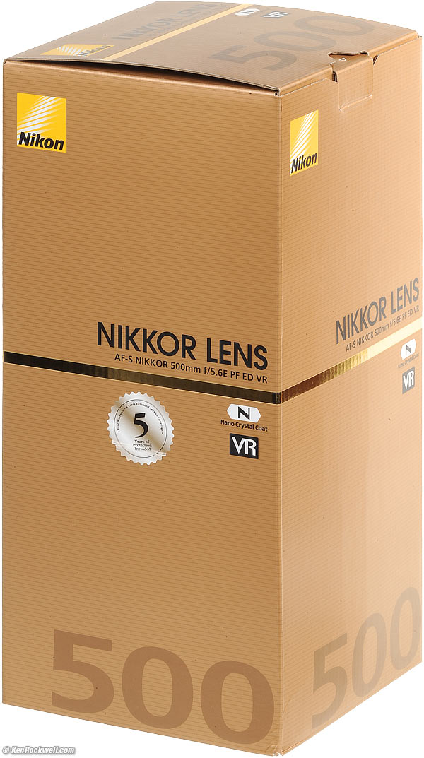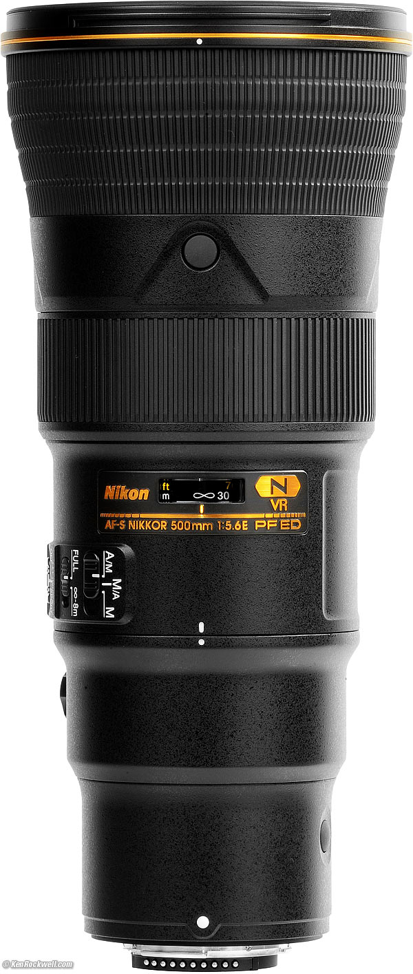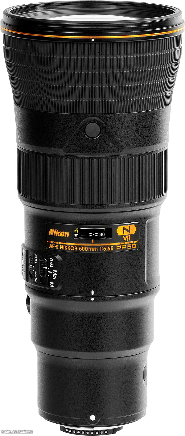 Nikon 500mm f/5.6 PFAF-S Ultralight Full-Frame VR UltrateleCompatibility Specs USA Version Nikon 500mm f/5.6 E PF (95mm filters, 51.3 oz/1,463g, 10'/3m close focus, $3,297). bigger. I got mine at Adorama. I'd also get it at Amazon, at B&H or at Crutchfield, or used at eBay if you know How to Win at eBay. This junk-free website's biggest source of support is when you use those or any of these links to my personally-approved sources when you get anything, regardless of the country in which you live. Nikon does not seal its boxes in any way, so never buy at retail or any other source not on my personally approved list since you'll have no way of knowing if you're missing accessories, getting a defective, damaged, returned, non-USA, store demo or used lens. Get yours only from the approved sources I use myself for the best prices, service, return policies and selection. Thanks for helping me help you! Ken.