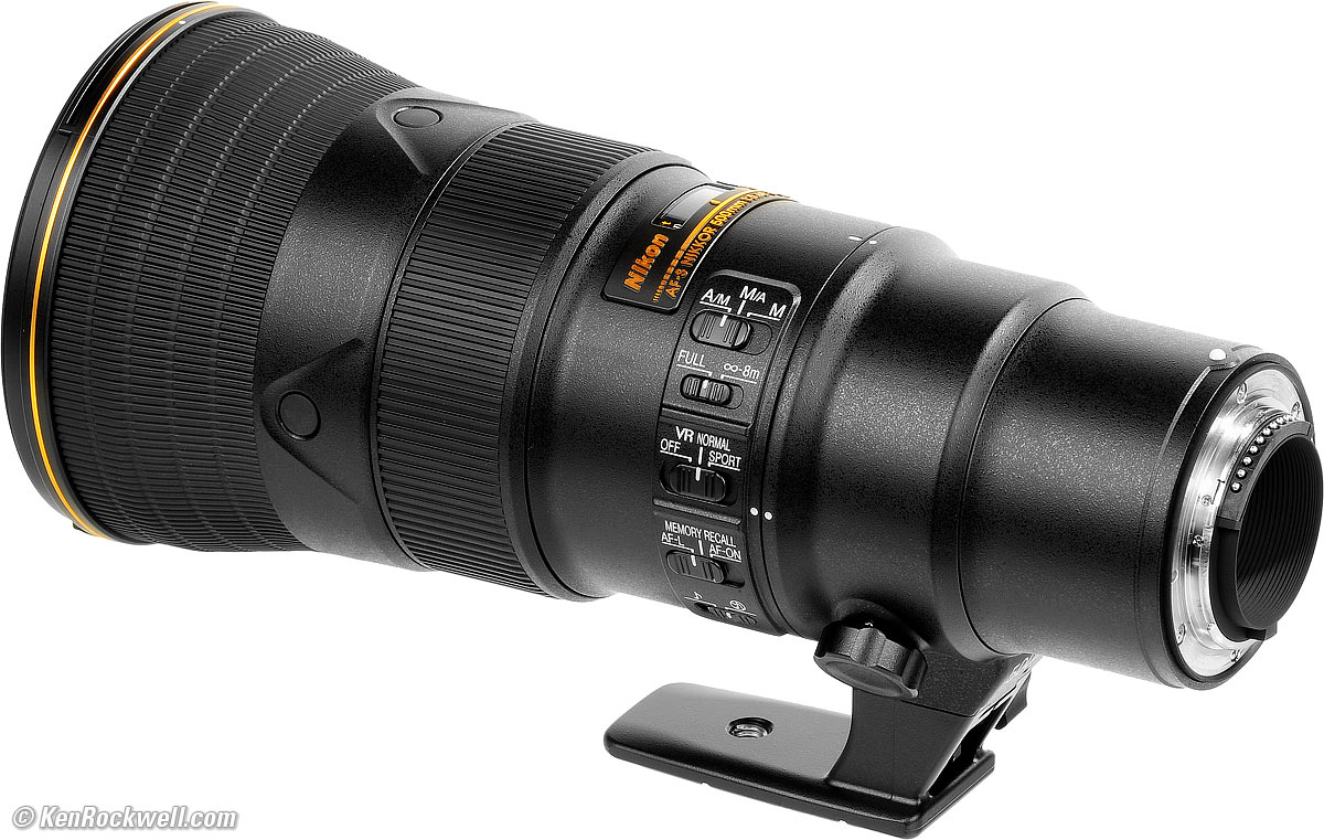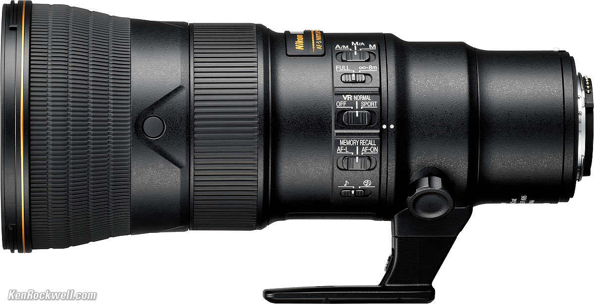 This is an ultralight 500mm ultratele. It's the smallest and lightest non-reflex 500mm lens ever made by Nikon. It uses a Fresnel element to reduce the amount of glass while retaining the same optical properties as a conventional lens. It only weighs as much as a 70-200mm f/2.8, but is a little bigger around and longer so it feels lighter (less dense). It weighs 30 oz (almost 2 pounds or 840g) less than the 200-500mm zoom, and is over an inch (30mm) shorter! This lens lives to be taken out, carried around and shot handheld. VR adds four stops of improvement for slow shutter speeds. You have instant manual-focus override just by grabbing the focus ring at any time, and there are programmable AF lock buttons around the front of the lens. I'd get my 500mm f/5.6 VR PF at Adorama, at Amazon, at B&H or at Crutchfield, or used at eBay if you know How to Win at eBay.