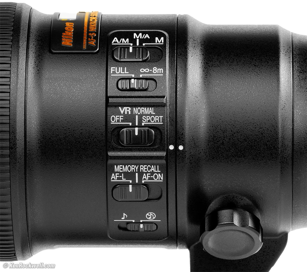 Nikon 500mm f/5.6 E PF. bigger. A/M — M/A — MA/M: Auto Focus. You have instant manual focus override by turning the focus ring at any time when in AF-S (single AF). If you're in AF-C (continuous AF) the camera will keep overriding you unless you move the focus ring fast and far enough to focus on a new subject. In this position the camera will tend to ignore (override) minor motion of the manual focus ring in continuous AF. M/A: Auto Focus. You have instant manual focus override by turning the focus ring at any time. Your manual focus setting will stay as set, even if the camera is in AF-C continuous AF. Avoid this setting if you have a habit of knocking the manual focus ring since even the slightest motion will stop the AF system. M: Manual Focus only.