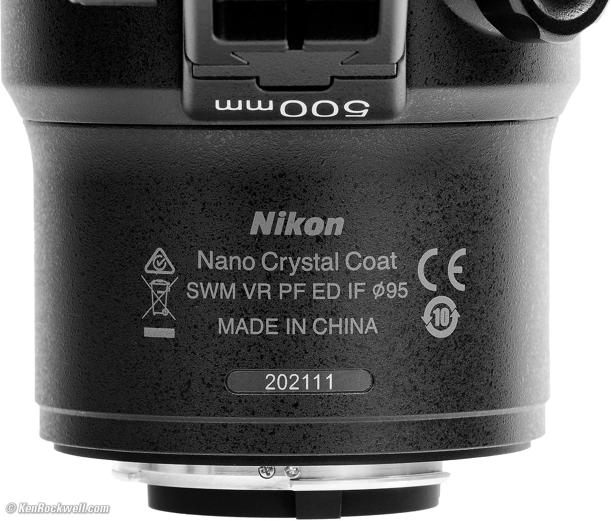 Mechanical QualityNikon 500mm f/5.6 E PF. bigger. The Nikon 500mm f/5.6 is made mostly of plastic in China, with mostly metal innards. I'll give them a little bit of a pass here as the whole point of this lens is light weight. HoodCrappy plastic bayonet, with metal locking pawl. For $3,600 I expect an alloy or carbon fibre hood with a rubber bumper. It has no rubber bumper; it's just lightweight plastic.