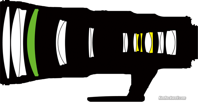 OpticsNikon 500mm f/5.6 PF internal optical construction. Fresnel and ED elements. bigger. 19 elements in 11 groups. 1 Fresnel element. 3 ED extra-low dispersion elements, which help reduce secondary axial chromatic aberration. Fluorine front coating to resist dirt and smudges. Nikon Super Integrated multicoating (SIC). Nano coating.