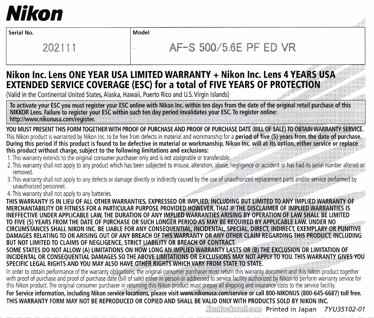 Getting a Legal USA VersionTop Sample Images Intro Format Compatibility Specs USA Version This section applies in the USA only. I'd get my 500mm f/5.6 VR PF at Adorama, at Amazon, at B&H or at Crutchfield, or used at eBay if you know How to Win at eBay. Nikon stopped offering 5-year lens warranties in 2021 in an effort to save themselves money at our expense. In the USA for lenses prior to 2021, be sure your box has a "5 Years" sticker as shown shown above, and most importantly for all models today be sure you get a USA warranty card with the same serial number as on the bottom of your lens: Nikon 500mm f/5.6 USA Warranty Card. bigger. If you don't have this card or the serial numbers don't match, you got ripped off with a gray market version from another country. (The serial number on the box doesn't have to match, but if it doesn't it means you bought from a shady dealer who took lenses out of boxes and then resold them as new.) This is why I never buy anyplace other than from my personally approved sources. You just can't take the chance of buying elsewhere, especially at any retail store, because non-USA versions have no warranty in the USA, and you won't even be able to get firmware or service for it — even if you're willing to pay out-of-pocket for it when you need it! Nikon USA enforces its trademarks strictly. It's unlikely, but possible that US customs won't let your camera back in the country if you bought a gray-market version in the USA, carried it overseas, and try to bring it back in. (If you take the chance of buying one overseas, be sure you have a receipt to prove you bought it overseas and be prepared to pay duty on it.) If a gray market version saves you $1,000 it might be worth it, but for $200 or less I wouldn't risk having no warranty or support. Always be sure to check yours while you can still return it, or just don't buy from unapproved sources or at retail so you'll be able to have your camera serviced and get free updated firmware as needed. Get yours from the same places I do and you won't have a problem, but if you take the risk of getting yours elsewhere, be sure to check everything while you still can return it.
