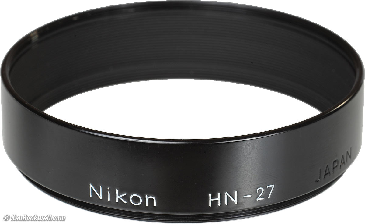 Hood top Nikon HN-27 Hood. enlarge. HN-27 metal screw-in, included. This hood is always left on. All it is is an 18.025mm-long filter ring extension tube.