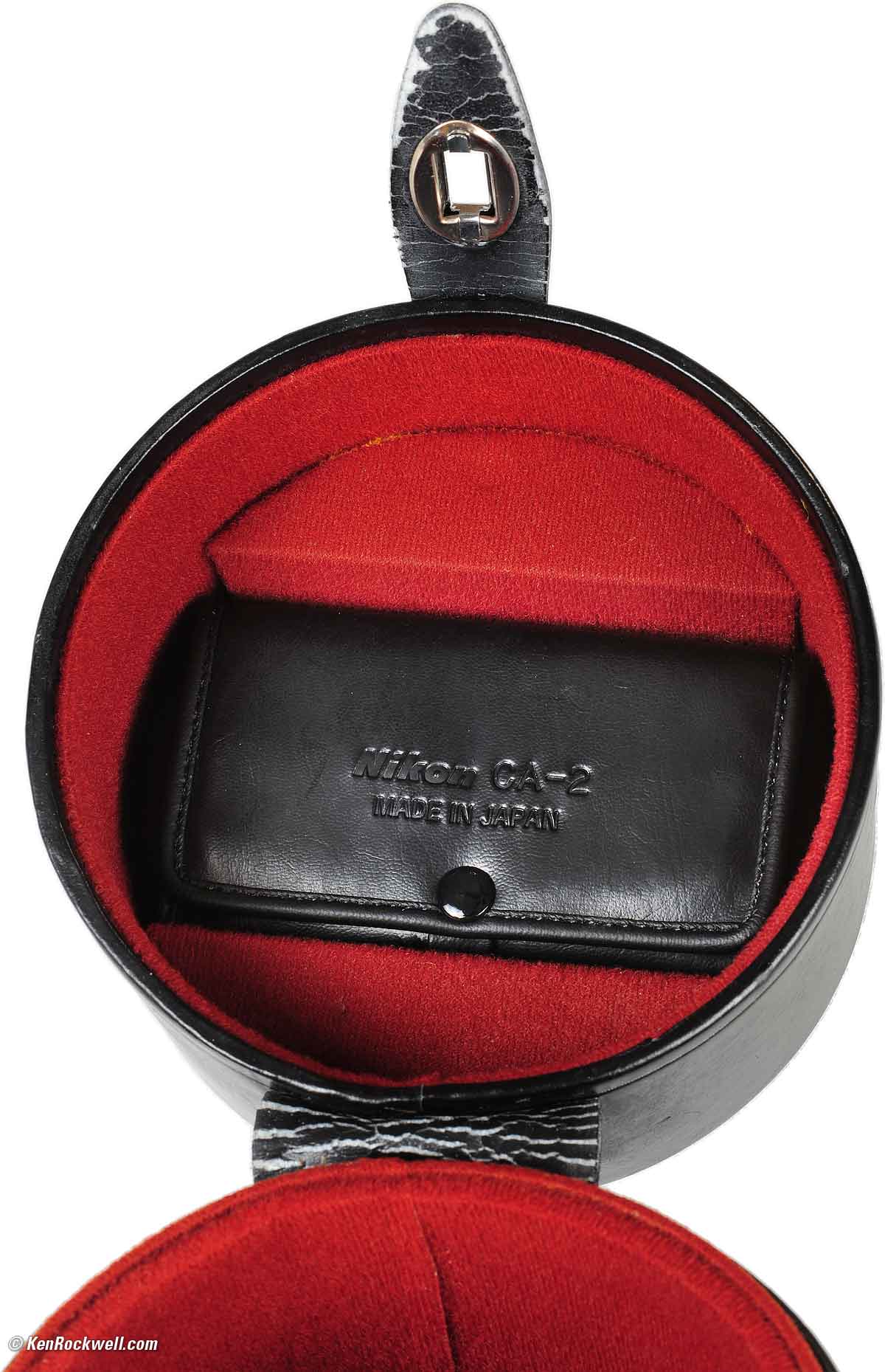 Filters top CA-2 filter case, hidden under red flap. enlarge. Comes with a complete set of five filters. The L37c (clear) filter comes mounted on the back of the lens. There is a CA-2 filter case hidden in the top of the lens case with four more filters: O56 (orange) for black-and-white film, A2 (amber) and B2 (blue) for slightly altering color balance, and ND 4x, to give the equivalent of T16 for no good reason. Use the L37c with digital cameras. Use the A2 outside with color slide film. The newer NC (no color) 39mm filter is Nikon part number 2478 NASI, and Nikon also made filters of other colors, like Y48, R60 and A12, in 39mm.