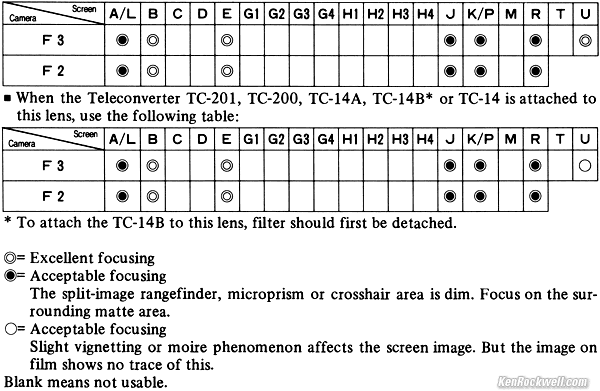 Focus Screens top Because this lens is so horribly slow, Nikon made some special focus screens to try to deal with it. The standard screen in most manual-focus cameras is the K screen, with split-image and microprism. The problem is that these turn black with a lens this slow. For the FA, FE, FE-2 and FM2, use the F3 column, and read K, B and E as K2, B2 and E2 as needed. Nikon 500mm f/8 N Suggested Focus Screens.