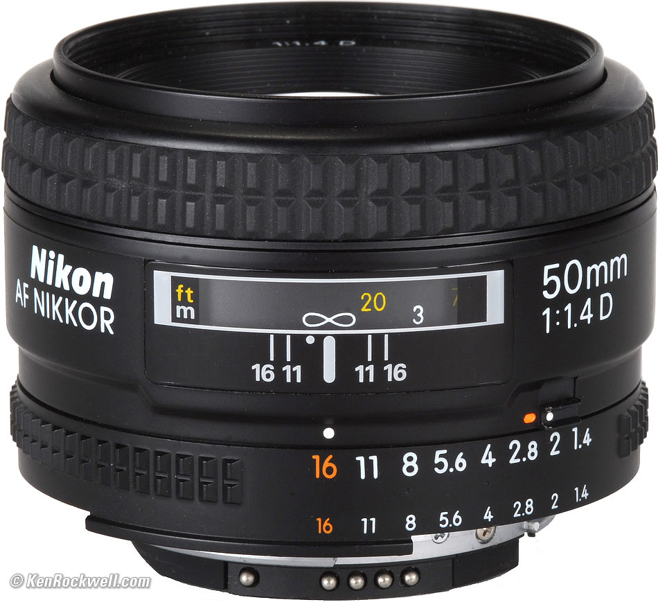 Recommendations top Intro Specifications Performance Recommendations I got my AF 50mm f/1.4D used at eBay (How to Win at eBay). Amazon may also have them. This is a great lens. It's one of the sharpest and fastest lenses made by Nikon, and it's reasonably priced. I shoot it all the time on my D3 for family and baby photos. I keep a 52mm Nikon NC filter and Nikon HR-2 rubber hood on it for protection. If you want an ultra-sharp, ultra-portable lens for use in daylight and are on a budget, the 50mm f/1.8 AF-D has the same image quality when stopped down an extra stop. Unlike the 85mm f/1.8 vs. f/1.4 question (where the f/1.4 costs three times as much and is made three times as solidly) I see no such difference in mechanical quality between these 50mm lenses. If you want to shoot in available light on a $5,000 camera, of course get this f/1.4 version. If you're on a budget, the 50mm f/1.8 AF-D is just about as good for one-third the price.