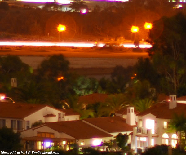 Nikon 50mm f/1.2 at f/1.2, crop at 100%. The blobs around the lights are spherical aberration. If I showed the corners, these would transmogrify into weird shapes called coma, which you can see at the sides of the full guide image at the top of this section. For night shots, the 50mm f/1.2 cleans up just a tiny bit at f/1.4 (8 second exposure): Comparison at f/1.4. (mouse-over) Trick: Roll mouse over to compare to the same thing with the 50mm f/1.4 AI. The f/1.4 lens looks awful here in the center, but in the corners the f/1.2 had even weirder coma, so they are about even over the DX frame. Here's the same thing at f/2: Comparison at f/2. (mouse-over) See how the image from the 50mm f/1.4 seems out of focus at f/2? That's focus shift due to spherical aberration., and I saw it a year ago in the f/1.4 lenses only at f/2. At f/2, the 50mm f/1.2 lens clearly is better than the 50mm f/1.4. Both these lenses were focused manually at their correctly calibrated infinity stops. Here's the same thing at f/2.8 (15 second exposure): Comparison at f/2.8. (mouse-over) These differences seem huge as shown here with controlled conditions, but honestly I never noticed them as obviously until I formatted them into this page as rollovers. You'd only see them in 44" (1.1m) wide prints, and then only is you looked at the prints as closely as you're looking at this screen. Notice the stars on the bright lights: they have 14 points from the 7-bladed diaphragm of the 50mm f/1.4 AI and 18 points from the 9-bladed diaphragm of the 50mm f/1.2 AI-s. As I wrote this page, a Chinese 50mm f/1.4 AF-D just arrived, and might be better than my older 50mm f/1.4 AI even though they have similar optics. One fine day (or night) when my D3 arrives I'll have another shootout. Return to where you were in the Nikon 50mm f/1.2 Review Return to top of Nikon 50mm f/1.2 Review