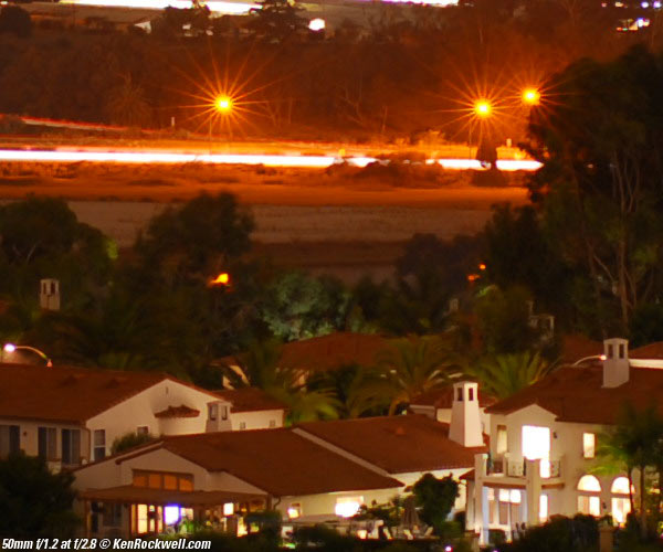 Nikon 50mm f/1.2 sunstars The 9-bladed diaphragm gives rise to extraordinary 18-pointed stars on brilliant points of light. They are hard to create in daytime, since you're asking for trouble if you point an f/1.2 lens at the sun. You'll go blind and destroy your camera. These stars become more prevalent at smaller apertures, but the 50mm f/1.2 only stops down to f/16. Here's a pair of crops from 100% images from my D200. (The full images are on my 50mm f/1.2 Sharpness page) Star comparison at f/2.8. (mouse-over to compare to the 50mm f/1.4 AI) I love the 18-point stars from the 9-bladed diaphragm. The f/1.4 lenses and earlier AI versions of the this f/1.2 and the AI Noct f/1.2 lenses only have seven-bladed diaphragms. The only other 9-bladed 58mm from Nikon is the 58mm Noct AI-s. I'd take even the 14-pointed star from other 7-blade lenses over the bogus 8-pointed stars of most of Canon's lenses any day (or night). These stars are how we tell if a shot was made with Canon or Nikon. You'll see them all the time from reflections of cars in car magazines.