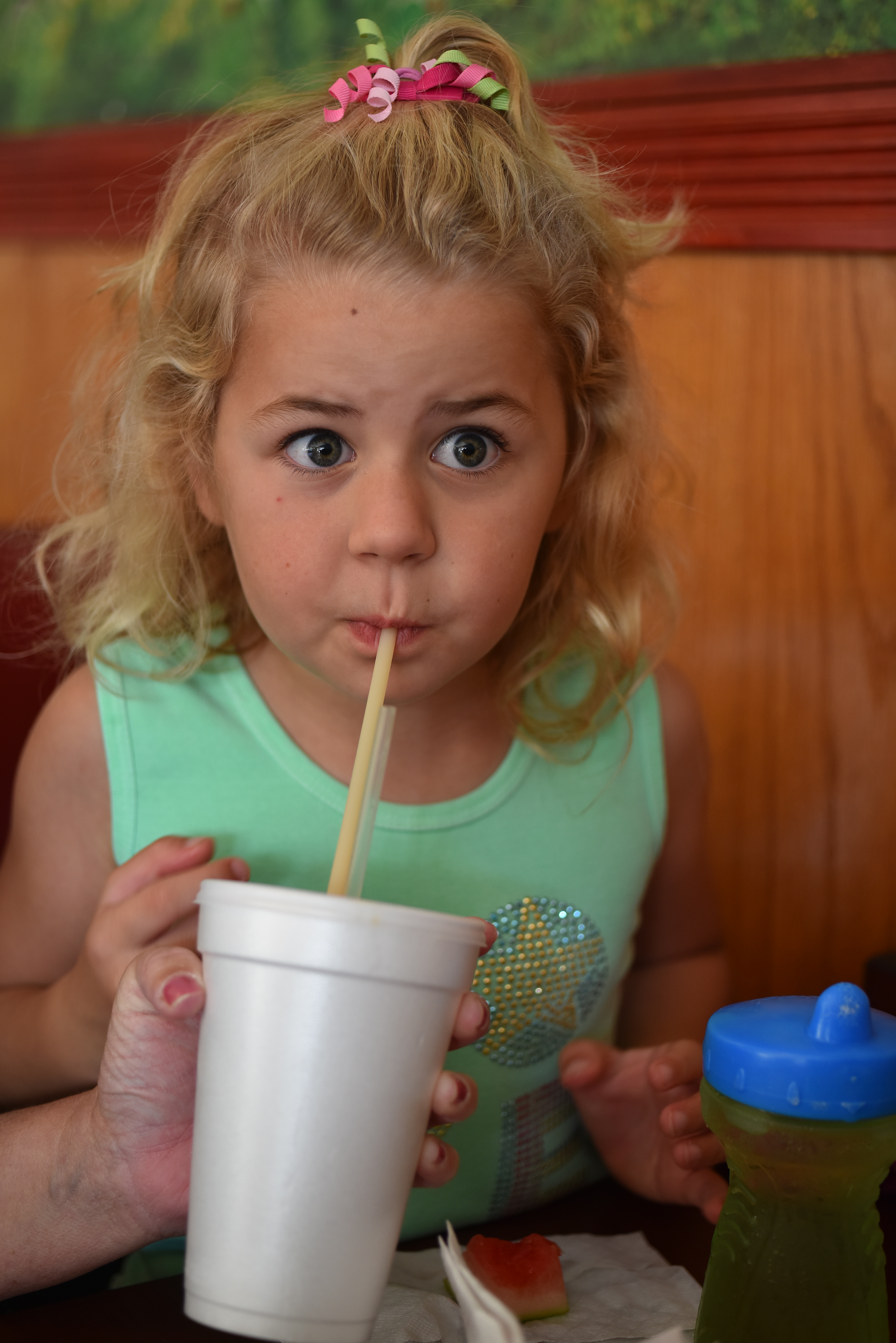 ISO 560: Katie drinking, 10:40 AM, 31 July 2014. Nikon D810, 55mm f/2.8 AF Micro-NIKKOR, f/2.8 at 1/125 at Auto ISO 560. © Camera-original LARGE BASIC JPG file. Crop from above image at 100%. If this is 6" (15cm) wide on your monitor, the entire image printed at this same high magnification would be a whopping 75 x 50" (6 x 4 feet or 1.9 x 1.3 meters)! © Camera-original LARGE BASIC JPG file. You can clearly see the restaurant reflected in little Katie's eyeball. Do we need any more resolution?