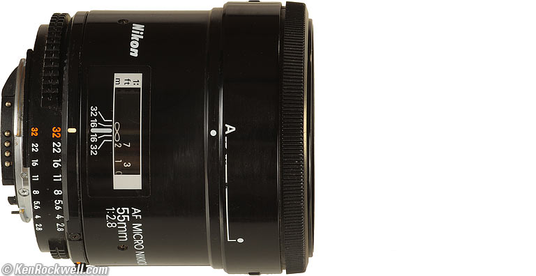 Introduction top Intro Specifications Performance Recommendations Compatibility History and Production Pricing The 55mm f/2.8 F is Nikon's first autofocus macro lens. It's also Nikon's sharpest autofocus lens. It uses the same optics as the extraordinary 55mm f/2.8 AI-s manual focus lens. This AF lens adds autofocus and extends the macro range to life size (1:1) in one continuous focus range. This is among Nikon's sharpest lenses ever, even wide-open at f/2.8. Nikon calls their macro lenses "Micro," and I'll use the two words interchangeably. When it came out with Nikon's other first AF lenses in 1986, everyone laughed because these were all plastic, and had hard, thin, nasty plastic focus rings. Only the outsides were plastic, to fit in with all the other 1980's hi-tech consumer electronics of the day. The insides are all metal. People, including myself, passed on these lenses back then because we didn't think they'd work well or hold up over time. We were wrong: this lens is over twenty years old and still outperforms most of my other new lenses. Even funnier to those of us with long-term outlooks, I'd rather own this excellent old klunker than the newest 60mm f/2.8 AF-S because this 55mm always autofocuses, even if I'm at the wrong end of the focus range. The newest AF-S lenses tend to hang-up and not autofocus if the focus is too far off to start, and the newest AF-S lens has 1/4" less working distance. The optics of this lens, the 55mm f/2.8 AI-s manual focus, the 60mm f/2.8 AF-D and 60mm f/2.8 AF-S are all virtually perfect. Any attempt to pick a winner among them will lead to your own insanity; they are all this good. Today I'd buy the 60mm f/2.8 AF-D, simply because these old 55mm AF lenses are very hard to find used. The 60mm AF-D is better for macro because it allows an extra 3/4" of working distance, however this 55mm lens is sharper for use at regular distances if you're really counting pixels.