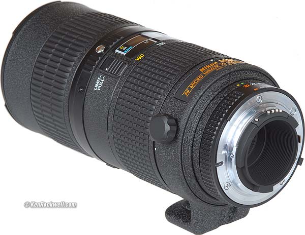 Recommendations top Intro Specifications Performance Recommendations Nikon AF 70-180mm Micro. bigger. This lens exists to allow you to change macro image size without moving your camera. This is very, very handy, especially for anyone chasing little animals around or any kind of macro work. Consider this little lens if you need both a 105 macro and an 80-200 zoom. It's much smaller than you think from looking at the catalog. This one lens can replace both these lenses in your bag. It's not fast in AF or aperture, but it is as small as either one of the others. This way you'd effectively have the function of both lenses while only carrying one. I use a clear (UV) protective filter instead of a cap (exactly like an iPhone) so I'm always ready to shoot instantly. I only use a cap when I throw this in a bag with other gear without padding — which is never. The UV filter never gets in the way, and never gets lost, either. The very best protective filter is the Hoya multicoated HD3 62mm UV which uses hardened glass and repels dirt and fingerprints. For less money, Olympus makes an RF-ZD62 PRO Protection Filter which is also optically superb, and the Nikon 62mm NC (No Color) protective filter is also an excellent choice, especially if you don't expect to abuse your filter and keep your fingers off the glass, but the Hoya HD3 is the toughest and the best. Filters last a lifetime, so you may as well get the best today. The Hoya HD3 stays cleaner than the others since it repels oil and dirt. I use my classic Nikon 62mm L37c (multicoated 370 nanometer UV) filters because I bought them back in the 1980s when they were the best, and they never wear out. Putting a 1980s 62mm L37c on this new lens gives a tip of the hat to when Nikon ruled the photography world. If I was working in nasty, dirty areas, I'd use an uncoated 62mm Tiffen UV filter instead. Uncoated filters are much easier to clean, but more prone to ghosting. For color slides like Fuji Velvia 50, I use a 62mm 81A outdoors. For B&W film outdoors to make clouds look natural in the sky I use a 62mm Hoya HMC K2 Yellow, or usually a 62mm Orange for a stronger effect, or a 62mm Hoya HMC Red for the most dramatic skies or to hide pimples on skin. All these filters are just as sharp and take the same pictures, the difference is how much abuse they'll take and stay clean and stay in one piece. Since filters last a lifetime or more, there's no reason not to buy the best as it will last you for the next 40 years. Filters aren't throwaways like digital cameras which we replace every few years, like it or not. I'm still using filters I bought back in the 1970s!