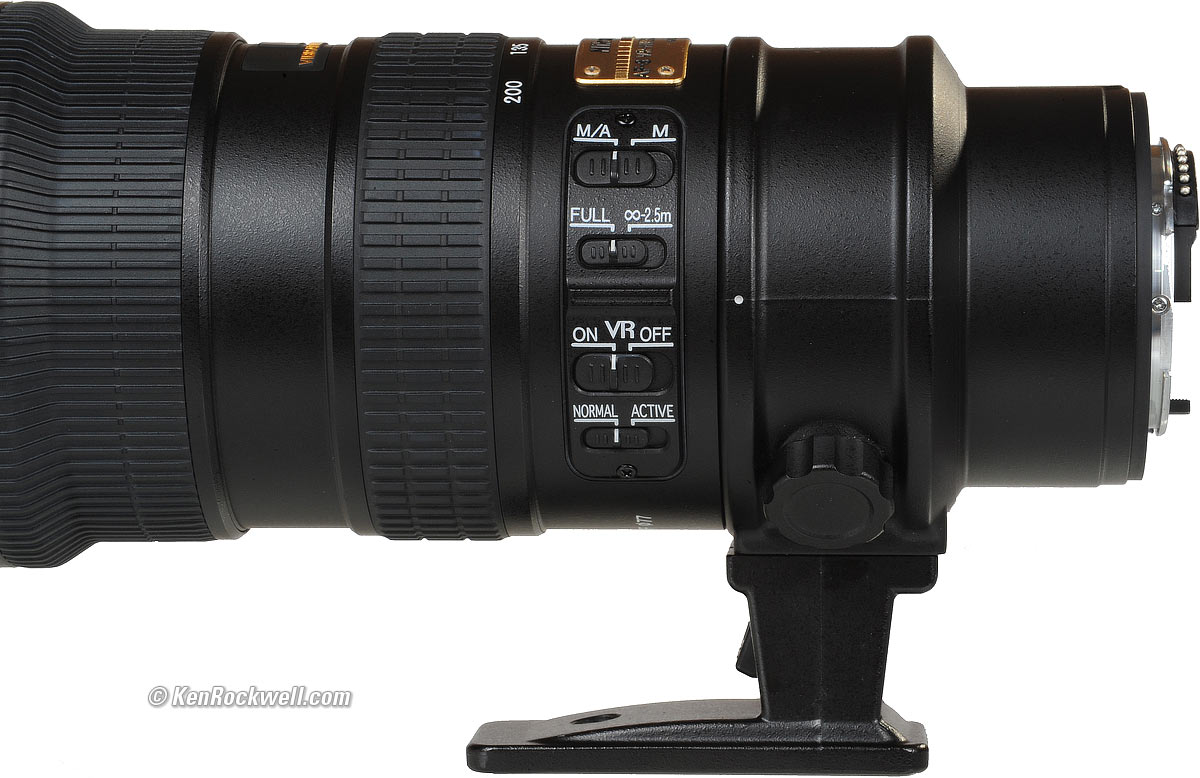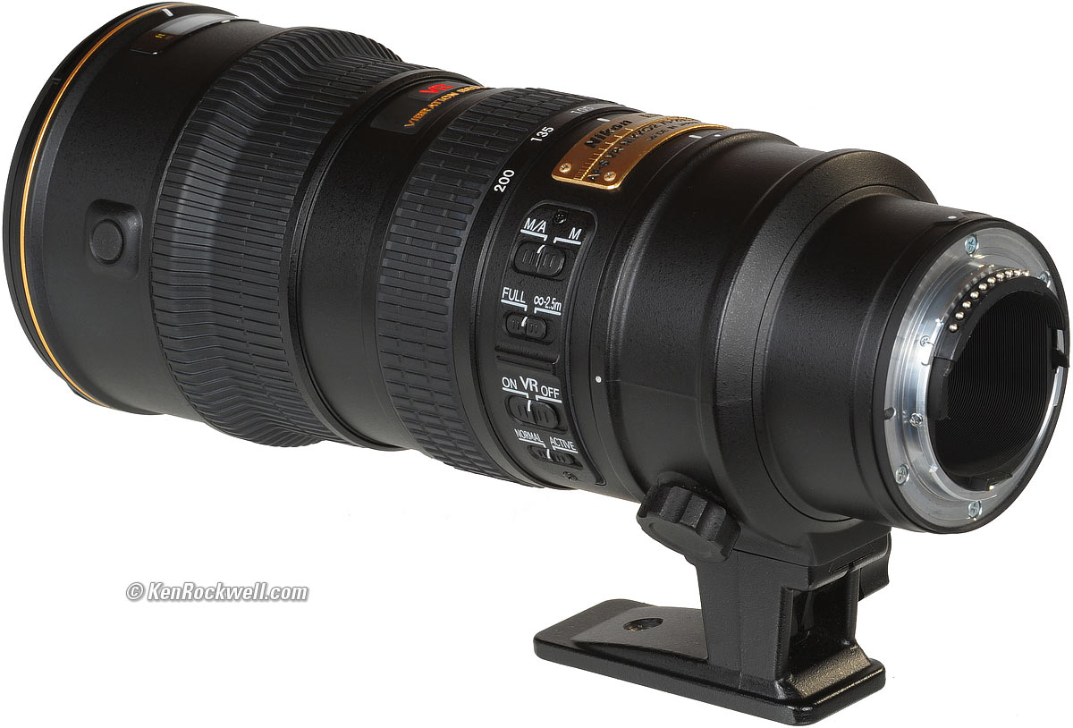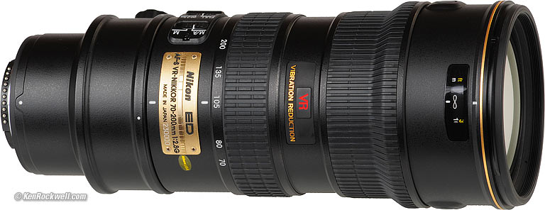 RecommendationsTop Intro Format Compatibility Specs This was the standard lens of the pros from 2003-2009, and today remains as a top professional lens. It's not cheap, even used. If you're a pro or rich amateur, this is the lens for news, sports and action. For you weekend portrait shooters, this is also your lens. For serious portraits, I prefer the 135mm f/2 DC or longer lenses. I like this lens for it's light weight (compared to other Nikon f/2.8 zooms) and ease of use. If you want to afford it by all means go get one. You'll love it. Everyone else I've met who owns one loves it to death. For serious amateurs and for photographing your kids at soccer, the $500 70-300mm AF-P VR FX is the lens to get if you don't want to afford this one. Again, this 70-200mm f/2.8 VR (or the 80-200mm AF-D) is one of the two lenses used by every professional photographer every day. The other lens is usually a wide zoom on a second body. This is Nikon's latest professional workhorse lens. I use a clear (UV) protective filter instead of a cap. I only use a cap when I throw this in my bag, otherwise I leave a clear filter on my lens at all times. The best protective filter is the 77mm Hoya multicoated HD3 UV which uses hardened glass and repels dirt and fingerprints. For less money, the B+W 77mm 010 is an excellent filter, as is the multicoated version and the basic multicoated Hoya filters or the 77mm Nikon Clear (NC - UV), but the Hoya HD3 is the toughest and the best. Filters last a lifetime, so you may as well get the best. The Hoya HD3 stays cleaner than the others since it repels oil and dirt, and will outlast this lens. For color slides like Fuji Velvia 50, I use a 77mm Nikon A2 or 77mm Hoya HMC 81A outdoors. For B&W film outdoors, I'd use a 77mm Nikon Y48 or O56 filter, or a 77mm Hoya HMC Yellow K2 or 77mm B+W Orange. Use a yellow filter for normal results outdoors on B&W, and I prefer the orange for stronger clouds. If you use no filter the skies and clouds will be washed-out because B&W film is overly sensitive to blue and ultra-violet light; a yellow filter gives a natural rendition. I'd get my 70-200/2.8 at Amazon or at eBay. This all-content, junk-free website's biggest source of support is when you use those or any of these links to approved sources when you get anything, regardless of the country in which you live. Nikon does not seal its boxes in any way, so never buy at retail or any other source not on my personally approved list since you'll have no way of knowing if you're missing accessories, getting a defective, damaged, returned, non-USA, store demo or used lens. I use the stores I do because they ship from secure remote warehouses where no one gets to touch your new camera before you do. Buy only from the approved sources I use myself for the best prices, service, return policies and selection. Thanks for helping me help you! Ken, Mrs. Rockwell, Ryan and Katie.