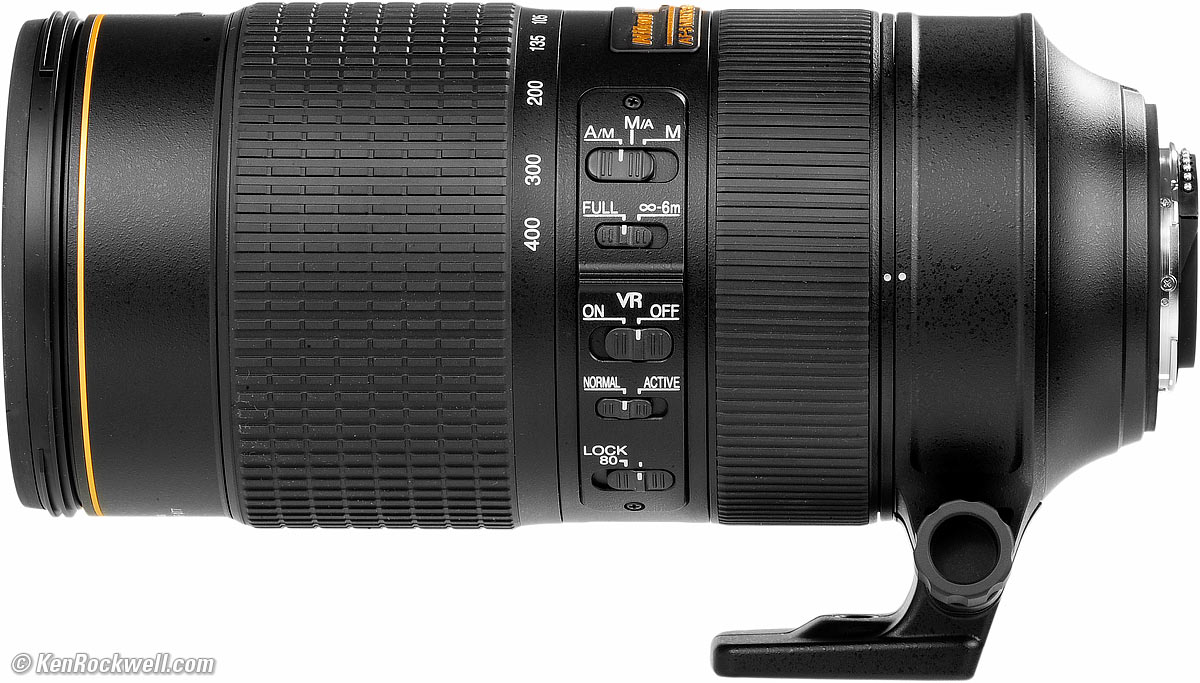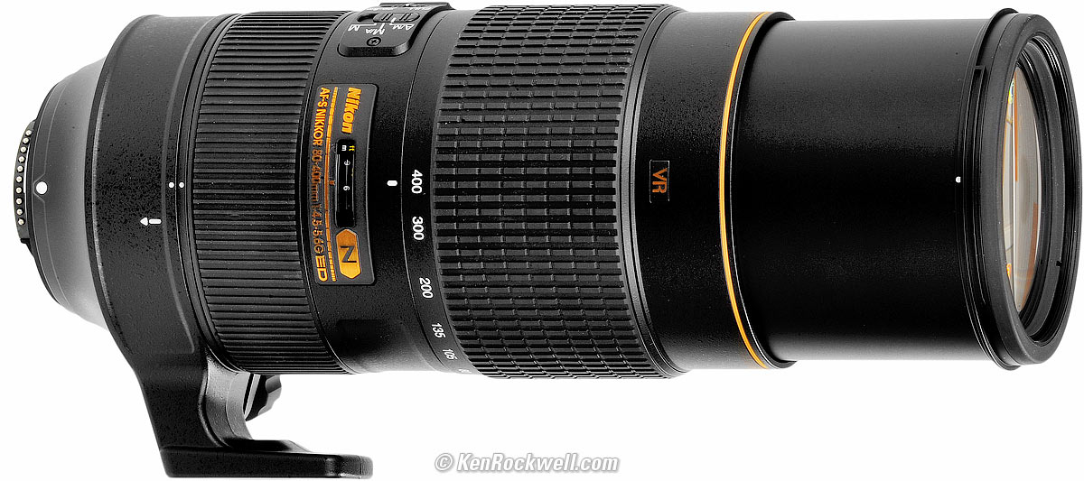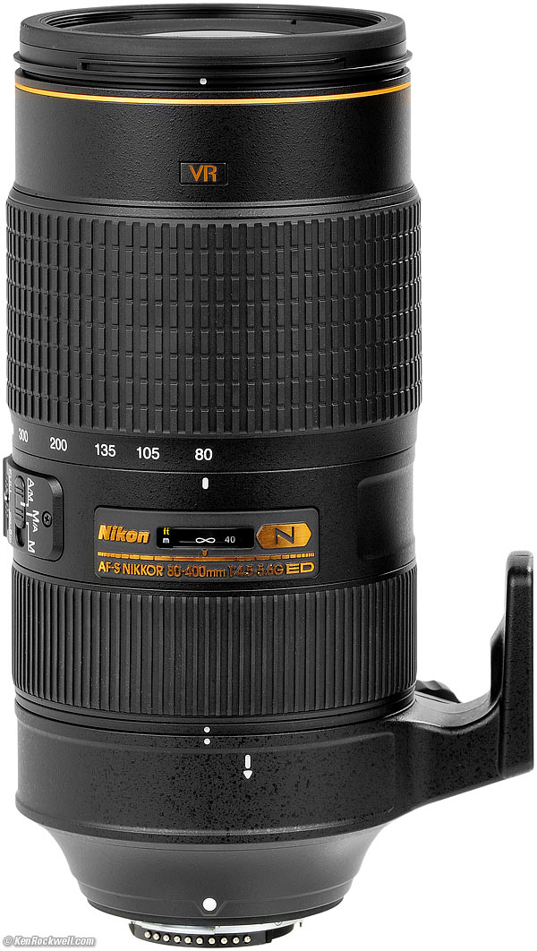 Home Donate New Search Gallery Reviews How-To Books Links Workshops About Contact Nikon 80-400mm AF-S Intro Specs Performance Usage Compared Recommendations More Nikon 80-400mm f/4.5-5.6 AF-S and included removable tripod collar (77mm filters, 55.1 oz./1,563g, 51.9 oz./1,470g without collar, 5.7'/1.75m close focus, about $2,297 new or about $675 used at eBay). enlarge. I got mine at Adorama, I'd also get it at Amazon or at B&H, or used at eBay if you know How to Win at eBay. This all-content, junk-free website's biggest source of support is when you use those or any of these links to my personally-approved sources when you get anything, regardless of the country in which you live. Nikon does not seal its boxes in any way, so never buy at retail or any other source not on my personally approved list since you'll have no way of knowing if you're missing accessories, getting a defective, damaged, returned, non-USA, store demo or used lens. Get yours only from the approved sources I use myself for the best prices, service, return policies and selection. Thanks for helping me help you! Ken.
