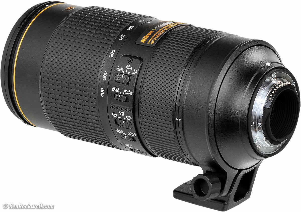 Recommendations top Intro Specs Performance Usage Compared Recommendations More This new Nikon 80-400mm f/4.5-5.6 AF-S VR is a big, expensive lens that's super sharp, focusses fast and has a great image stabilization for hand-held shots at foolishly long exposure times. It focuses as close as most 80-200mm f/2.8 zooms! I got my 80-400 VR at Adorama, I'd also get it at Amazon, at B&H, at Crutchfield or used at eBay if you know How to Win at eBay. If you don't mind the expense and size and weight, there's no reason not to use this as your general-purpose tele zoom. Personally I prefer the size and weight of the 70-300mm VR, and honestly, prefer the convenience of the 28-300mm VR. I rarely need 400mm, but would always have to carry the extra weight of this lens even if I never zoom to 400mm. I haven't used my original 80-400mm AF-D VR since I got my newer, smaller and handier 70-300mm VR, and my 70-300mm has sat unused ever since I got my 28-300 VR, which pretty much benched my entire FX lens line-up. My 28-300 VR replaces every FX lens for me except my ultrawides. Personally, I need to zoom-out to 70mm far more often than I need to use 400mm, so again, if I didn't prefer my 28-300mm VR, I'd always carry my 70-300mm VR instead of any 80-400mm lens. I'd never get the 200-400mm f/4 VR, which for two-and-one-half times the price and over twice the weight has a far more restricted zoom range. If you regularly need to get to 400mm, this is the sharpest lens other than Nikon's dedicated 400mm lenses. As mentioned above, for the same size and weight, I'd get the fully professional 70-200 f/2.8 II for a little less money than this slower consumer lens. I prefer the build quality, speed, close-focus and 70mm end of the 70-200/2.8 over trading all that for the sole benefit of getting to 400mm at f/5.6 on this new 80-400. Since the 70-200 f/2.8 II costs $300 less, I could get the 70-200 f/2.8 II and the TC-20E II to give me the same 400mm f/5.6 range. People who can't easily crop, like those shooting 35mm slides for projection or very low-resolution DX cameras like the original Nikon D1 (only 2.7 MP) might actually need 400mm versus 300mm, but 99% of us easily can crop from 300mm to get the same thing, without having to carry a 400mm lens. This is the huge advantage we now have with today's extreme-resolution cameras. Is this new lens worth $1,000 more than the original 80-400mm AF-D VR that does the same thing just to get fast autofocus? Only you can tell if it's worth it — to you. This is a marvelous lens, and marvelously sharp. If you want one for snapping sunsets and green flashes, far-away animals and your kids on the very far end of the field, by all means get and enjoy this new 80-400 AFS G lens; it's a big step up from the previous model. For those of you looking for the ultimate long Nikon zoom, this new 80-400 VR is it. I got my 80-400 VR at Adorama, I'd also get it at Amazon, at B&H, at Crutchfield or used at eBay if you know How to Win at eBay. If you've found the time, effort and expenses I incur researching and sharing all this for free, this website's biggest source of support is when you use those or any of these links when you get anything, regardless of the country in which you live. This is what supports my efforts and is how I support my family today. I receive nothing if you don't use these links. Thank you! Ken.