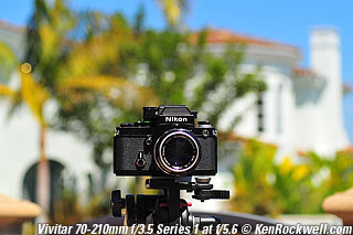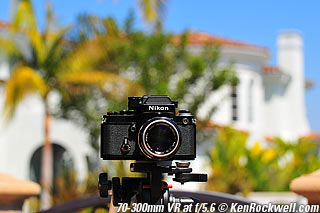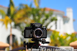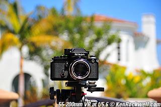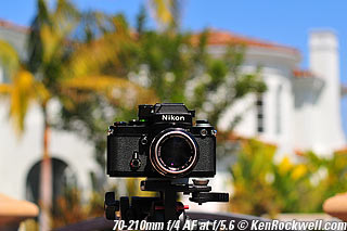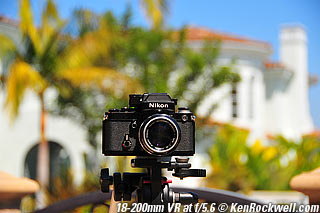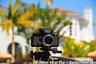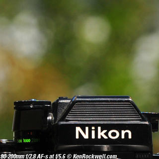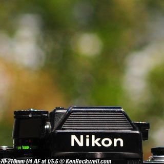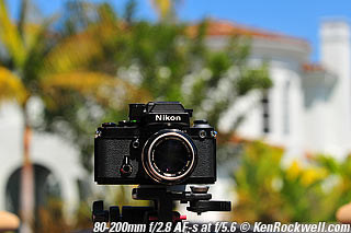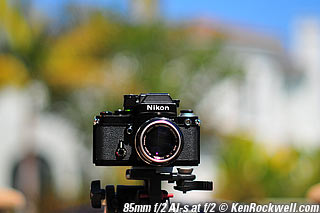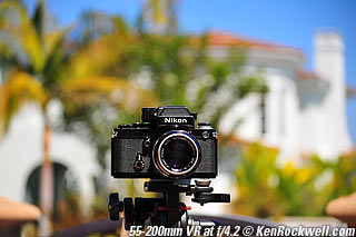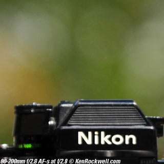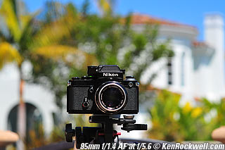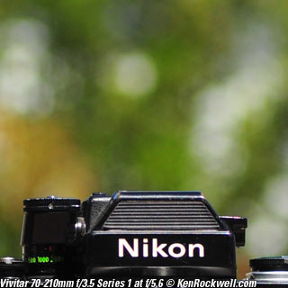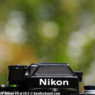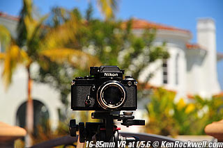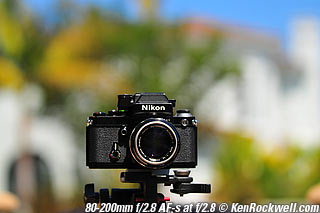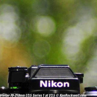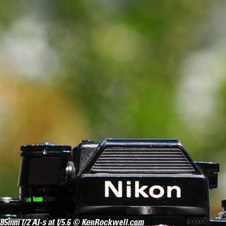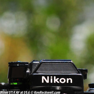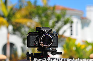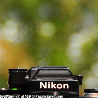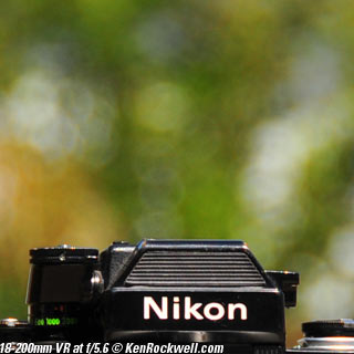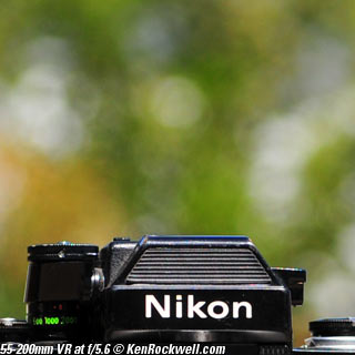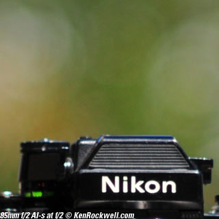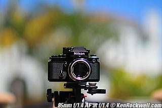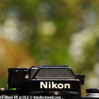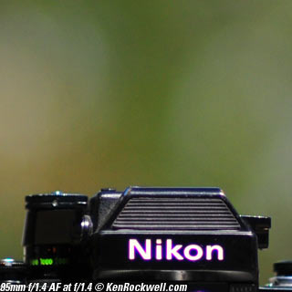 Nikon 85mm Bokeh Comparison Please help support more research March 2008 This comparison grew out of a request to compare the bokeh of the Nikon 16-85mm VR to the Nikon 18-200mm VR, with each set to 85mm for portraits. Bokeh is how out-of-focus areas look. Even if a background is out of focus, various optical issues can cause unwanted details to appear and make the background distracting. I have a whole page explaining bokeh. Honestly, either of these lenses is a poor choice for serious portraiture if you want to lose the backgrounds, but let's see what happens anyway. The reason these two lenses are poor choices simply is that 85mm is too short (you have to get too close), and f/5.6 is too slow to throw much of anything out of focus. See also Selecting Portrait Lenses. I started to design the test procedure, and realized I could throw 9 images up 3x3 for comparison. Thus, in the true spirit of American science and exploration, I grabbed a few other relevant lenses to see what happens. Lenses Compared top The nine lenses are: You may click any image below to get to details and my complete review of that individual lens, as well as the links above. The 85mm f/2 AI-s is a reasonably common and reasonably inexpensive (around $200) professional manual-focus lens. It works perfectly on the D200, D300, D2 series and D3. (see Nikon Lens Compatibility for more about what works on what with manual focus lenses. Manual focus lenses don't do much on the D80 and below). The 70-300mm VR is a very popular amateur telephoto zoom (about $500). The 85mm f/1.4 AF-D is a professional autofocus lens (About $1,000). The 55-200mm VR (about $220) is an excellent and inexpensive telephoto. The 16-85mm VR and 18-200mm VR are expensive (about $700 each) multi-purpose amateur zooms. The 70-210mm f/4 AF was Nikon's very first autofocus zoom from 1986. It has a constant f/4 aperture. They sell used for about $175. The 80-200mm f/2.8 AF-s was Nikon's flagship professional telephoto zoom from 1999 - 2004. They sold new for $1,600 and sell used today for about $1,200. I threw in the Vivitar 70-210mm f/3.5 Series 1 because I suspected it would work much better than either of the expensive 16-85mm VR or 18-200mm VR lenses, and the Vivitar can be bought at garage sales for about nothing. Mine set me back $35; and I didn't bother haggling with the seller. I didn't include the very relevant 85mm f/1.8 AF-D (about $400) or either of the current 70-200mm f/2.8 VR or 80-200mm f/2.8 AF-D simply because I didn't have any floating around. I work with what I can borrow at the time. I suspect the 85mm f/1.8 AF-D would probably be almost as good as the superb 85mm f/1.4 AF-D, but 85mm lenses are usually too short for anything serious except for whole-body shots (see also Selecting Portrait Lenses). The Set-Up top I used my Nikon F2AS as a model. I set it on a tripod and set the camera with which I shot these examples, a DX-format D300, on another tripod six feet (1.8m) away. Portraits should be shot from at least 15 feet (5m) for the most natural rendering, which shows you why 85mm (or 105mm) is too short for great head shots. In actual use at six feet, different lenses set to what seems like the same focal length give different image sizes. I set the 16-85mm VR and 18-200mm VR to 85mm. I set the 70-300mm VR and 55-200mm VR each to 72mm to get the same angle of view. I set the 70-210mm f/4 AF and Vivitar 70-210mm f/3.5 Series 1 each to 70mm to get the same angle of view. I set the 80-200mm f/2.8 AF-s to its shortest setting, 80mm, and it had a much tighter field of view than any of the others. A 70mm setting probably would have matched like the others. Each of the fixed 85mm lenses had a slightly smaller angle of view, suggesting that the 16-85mm is cheating a bit at close distances. Don't pay attention to the sharpness of the Nikon F2AS; that depends more on how carefully I aligned the AF sensor to the Nikon logo or the lens that was on the F2AS. Results: Full Images top Here are the full images from my D300, shooting each lens at f/5.6.