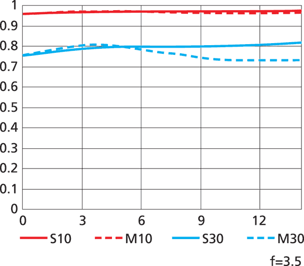 Sharpness performance top Warning 1: Image sharpness depends more on you than your lens. Warning 2: Lens sharpness doesn't mean much to good photographers. With those caveats, the Nikon 85mm f/3.5 G DX VR AF-S Micro-NIKKOR ED is not as sharp as a Micro-NIKKOR is expected to be. This won't affect your photos, but screw it, Nikon doesn't pay me or send me any Christmas cards; I wouldn't buy this Chinese Nikon lens when the Tokina 100mm f/2.8 Macro is sharper, less-distorted, and costs less. Doesn't vary much with aperture or position in the frame. Except for diffraction, it's about the same regardless of setting. My sample didn't perform well enough to support Nikon's claimed MTF curves. This curve is excellent, but the sample I actually tested is not.