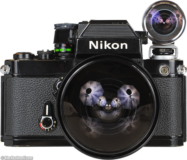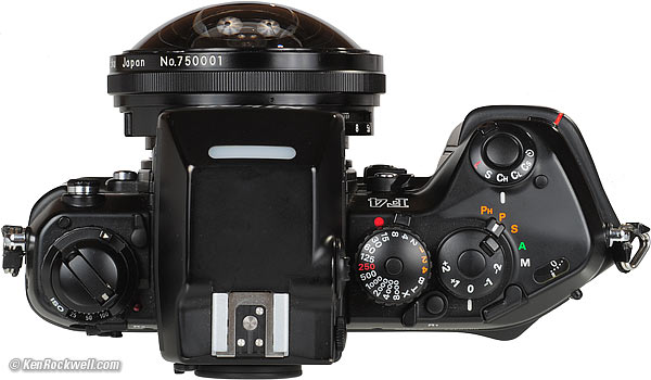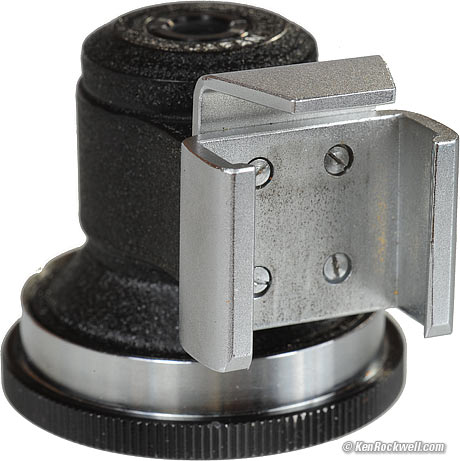 On the Nikon F If you're serious about this 8mm lens, you've seen the picture of it mounted on a Nikon F with non-metered finder and the dedicated fisheye finder over the rewind crank. This is the easiest way to use this 8mm lens, since the F was the camera that was current along with this fisheye in the 1960s. The biggest gotcha with an early Nikon F with non-metered finder is that you lose one frame of film in order to engage the mirror lock-up. If you leave this lens on a Nikon F, you don't lose any frames if you always leave the mirror up. Weird proprietary mounting foot. There are big catches to using this finder on any camera other than the most primitive Nikon F: 1.) The newer Photomic (metered) finders of the newer Nikon Fs were so big that the 8mm lens can't mount at all; you have to go find one of the original non-metered prisms or simply remove the Photomic finder and cap-off the top of the Nikon F. 2.) The Nikon F and F2 never had standard flash shoes! Flash shoes were for amateur cameras in the 1960s; pros used flash guns mounted with a bracket on the side of the camera. The finder slips over the weird dedicated contact over the rewind crank of the F and F2, which means it does not fit a standard hot shoe of any modern camera!