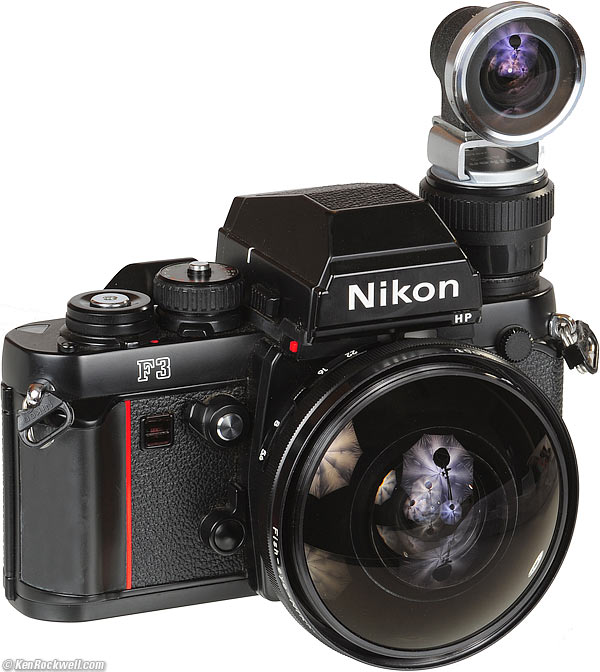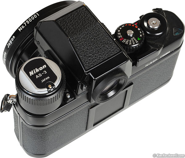 On the F3 The F3 is the most sane electronic camera on which to use the 8mm. This is because you can mount the finder without too much hassle today, and shoot hand-held. Nikon F3HP with Nikon 7.5mm f/5.6 and finder mounted with an AS-3 adapter. There's a small catch: you need to buy an AS-3 adapter to let the finder mount on the different dedicated flash shoe of the F3. (the F3 uses a different non-standard shoe than the non-standard shoe of the Nikon F and F2!) The AS-3 converts the F3's weird mount into the Nikon F and F2's weird mount for which the finder is designed. That's right: the F3 has no hot shoe either! Since you still can buy the AS-3 for about $10, you're AOK with the F3. The AS-3 lacks the spring-loaded clamping of the Nikon F and F2's mount, so a rubber band might be needed to keep the finder from slipping off backwards. Nikon AS-3 flash adapter on an F3HP.