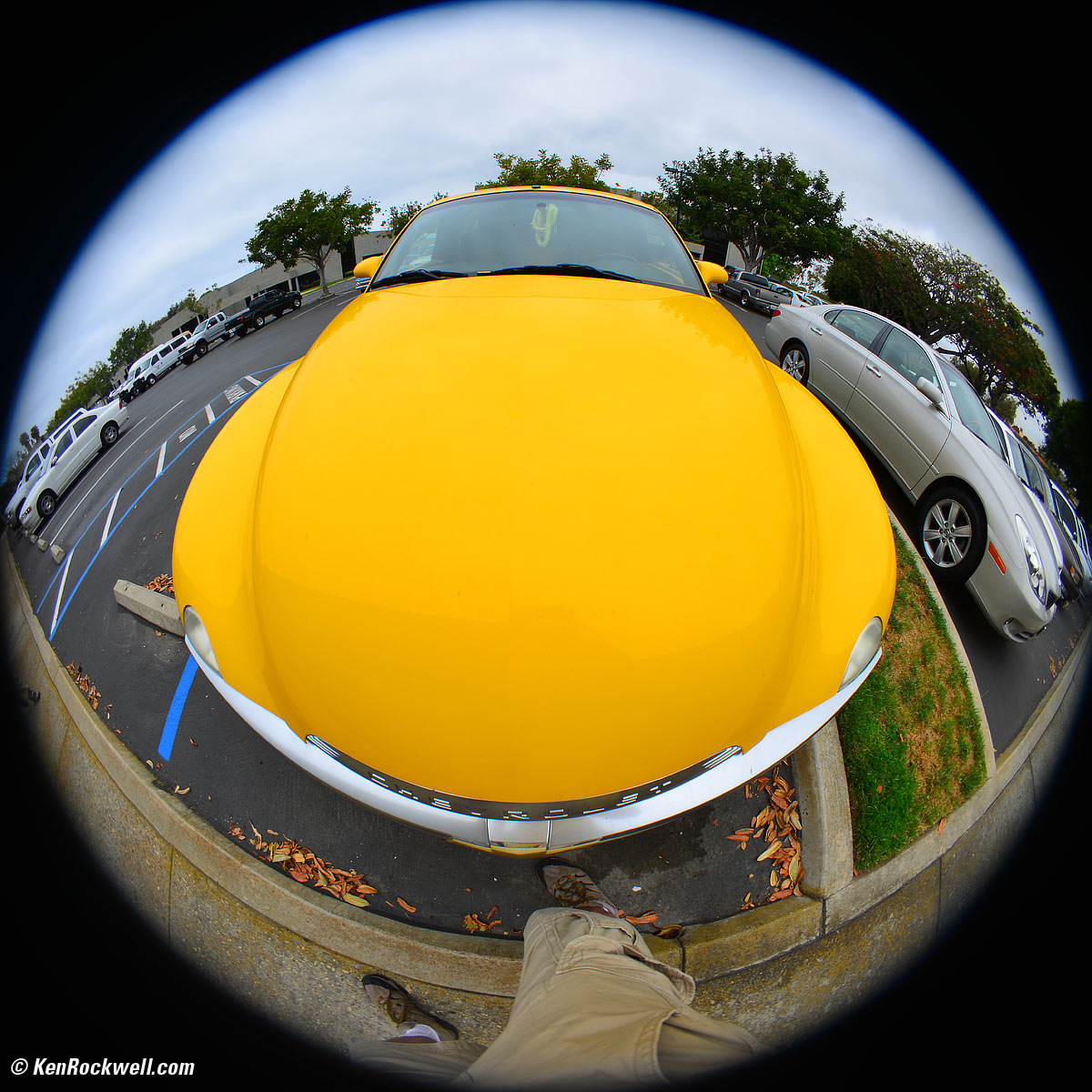 Falloff (darkened edges) performance top Yellow SSR from a few inches, and my shorts and shoes. (f/8 at 1/125, cropped to square from D800 at ISO 100.) bigger. While there isn't any falloff, the edges do fade to black more softly than they do with the 8mm f/2.8, whose edges cut to black sharply. I'd rather have the edges sharp today, since I always can fade them later, but if I want a fade-to-white for online use, it's much tougher with the softer edges of this 8mm lens' images.