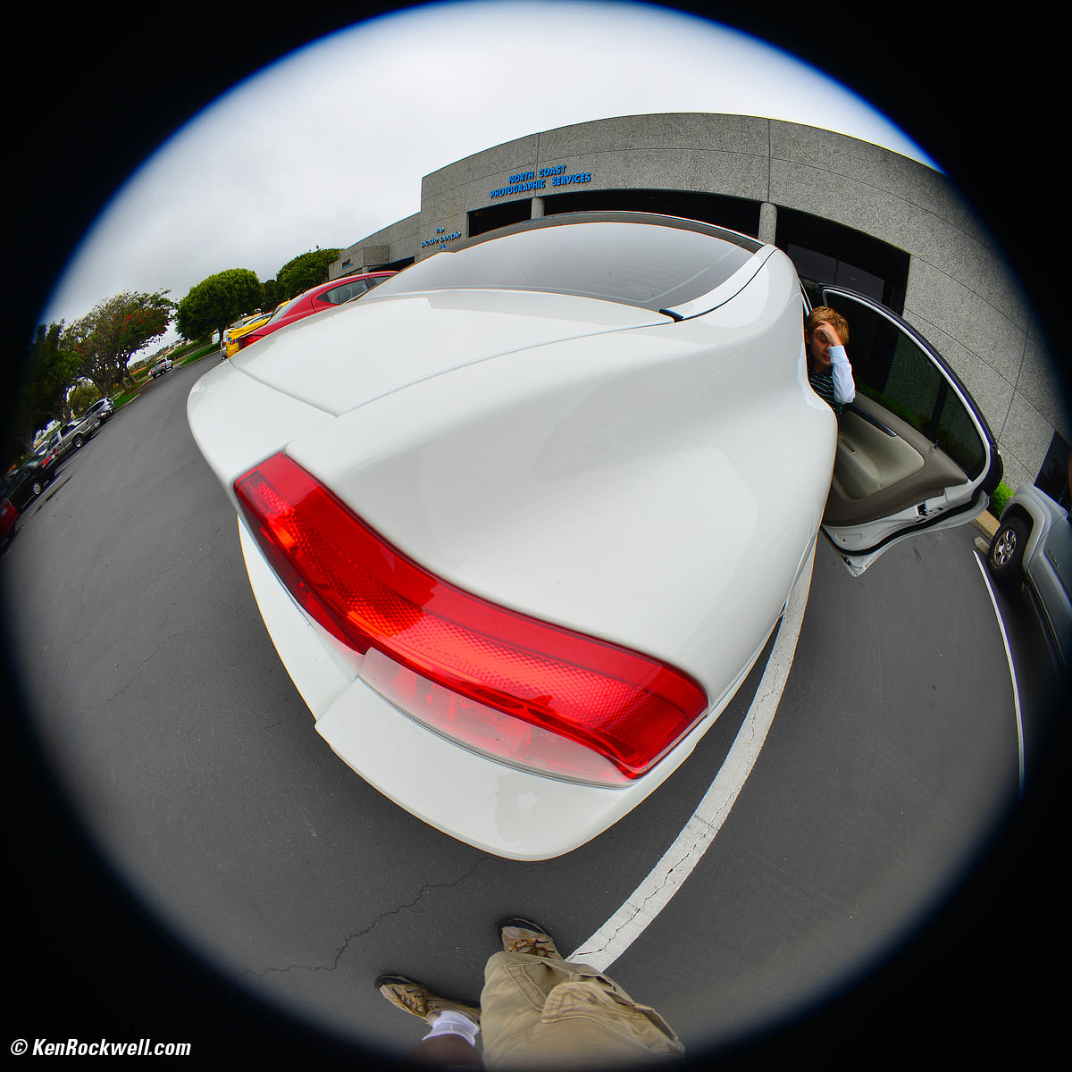 This 8mm f/8 is Nikon's earliest 35mm-format 180-degree circular fisheye lens. The sample reviewed here in 2012 was made in 1964. Its image is a 24mm-diameter circle filling the middle of the FX frame, surrounded by black: Image on FX. (f/8 at 1/125, D800 at ISO 100. Ryan in car, Dada's legs at bottom, about 2" from car.) bigger (cropped to square). This 24mm diameter image circle is the largest of any Nikon circular fisheye. As you see above, since 24mm is the nominal maximum vertical size of the film or sensor, you often lost the top or bottom edge, so newer models reduced this to 23mm. Used on DX, the image reaches from left to right along the center line, but with black triangles in each corner and the top and bottom of the circle cut off. This 8mm's primitive design pokes deeply into your camera, so it requires locking-up the mirror to mount it. If you don't lock-up your camera's mirror, you'll smash it attempting to mount this lens. Focus is easy: since everything is always in focus with an 8mm lens at f/8, focus is fixed. This is much easier to use than the 8mm f/2.8 which adds the annoyance of a focus control which gets knocked off-focus more often than you'd think. Even wide-open at f/8, this small 8mm fisheye is always in focus from a few inches to infinity. With Live View DSLRs — and if you're not afraid of lifting your DSLR's mirror with your dirty little fingers while trying to attach this thing — it works far better on today's DSLRs than it ever did when new! It was, and still is, a royal pain to use on the 35mm cameras for which it was designed. Without Live View, you can't look through any camera to see what you're photographing. You have to use a special finder that comes with the lens and slip it on the weird accessory shoe of your Nikon F or F2. The finder does not slip into a standard hot shoe, or mount directly on any other Nikons! 160 degree viewfinder and its own screw-in midget cap. The finder isn't needed or wanted with Live View. The finder, if you use it with a 35mm camera, is very sharp. This 8mm is more of collectors' item today, since you can buy a brand-new Pro-Optic 8mm f/3.5 for less money, which is far easier to use and which has far better optical performance. The Pro-Optic 8mm f/3.5 is designed for DX cameras; it's not a circular FX fisheye as is this 8mm f/8.