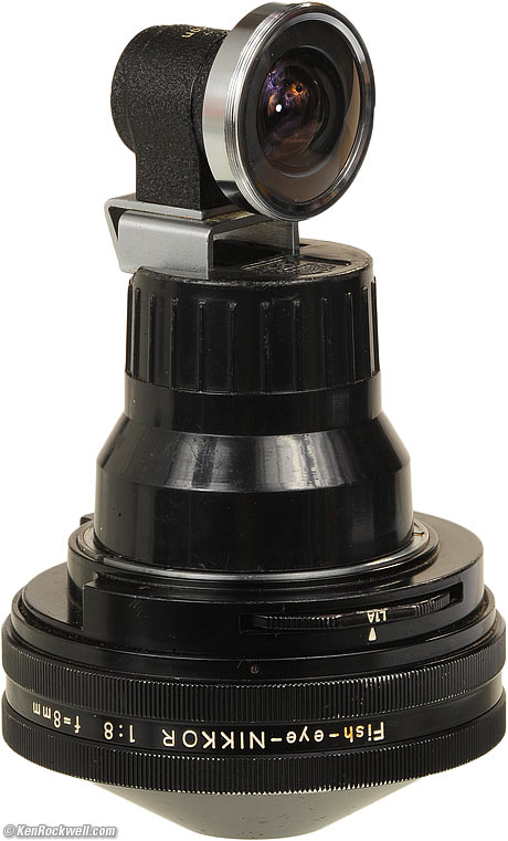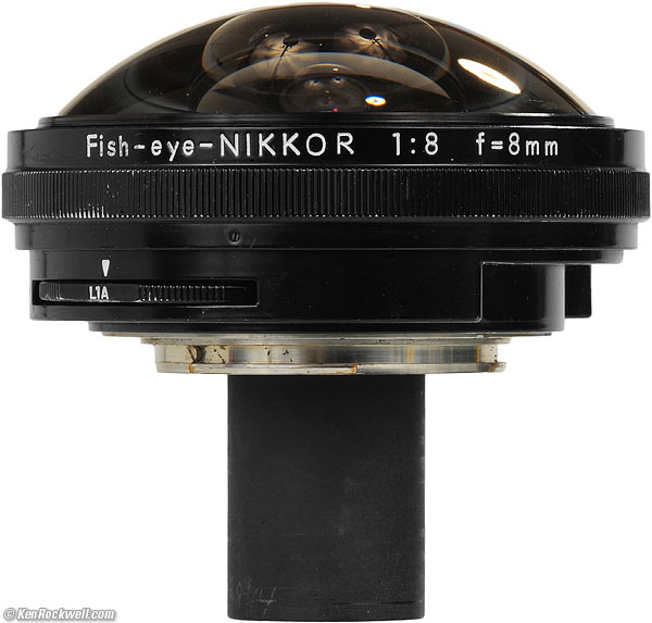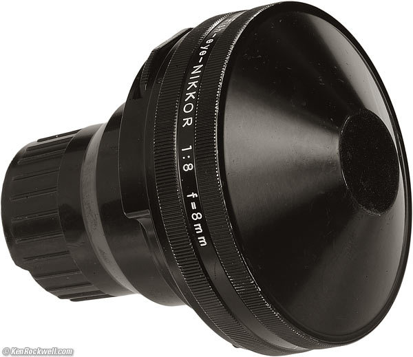 Nikon 8mm f/8Fish-Eye-NIKKOR (1962-1965)Intro Specs Performance Usage Recommendations Nikon 8mm f/8 Fisheye (built-in filters, 10.4 oz./295g, maybe about $500 used if it has all the parts.). enlarge. The back of the lens pokes way back from the chrome mount. This free website's biggest source of support is when you use these links, especially this link directly to them at eBay (see How to Win at eBay) when you get anything, regardless of the country in which you live. Thanks! Ken.