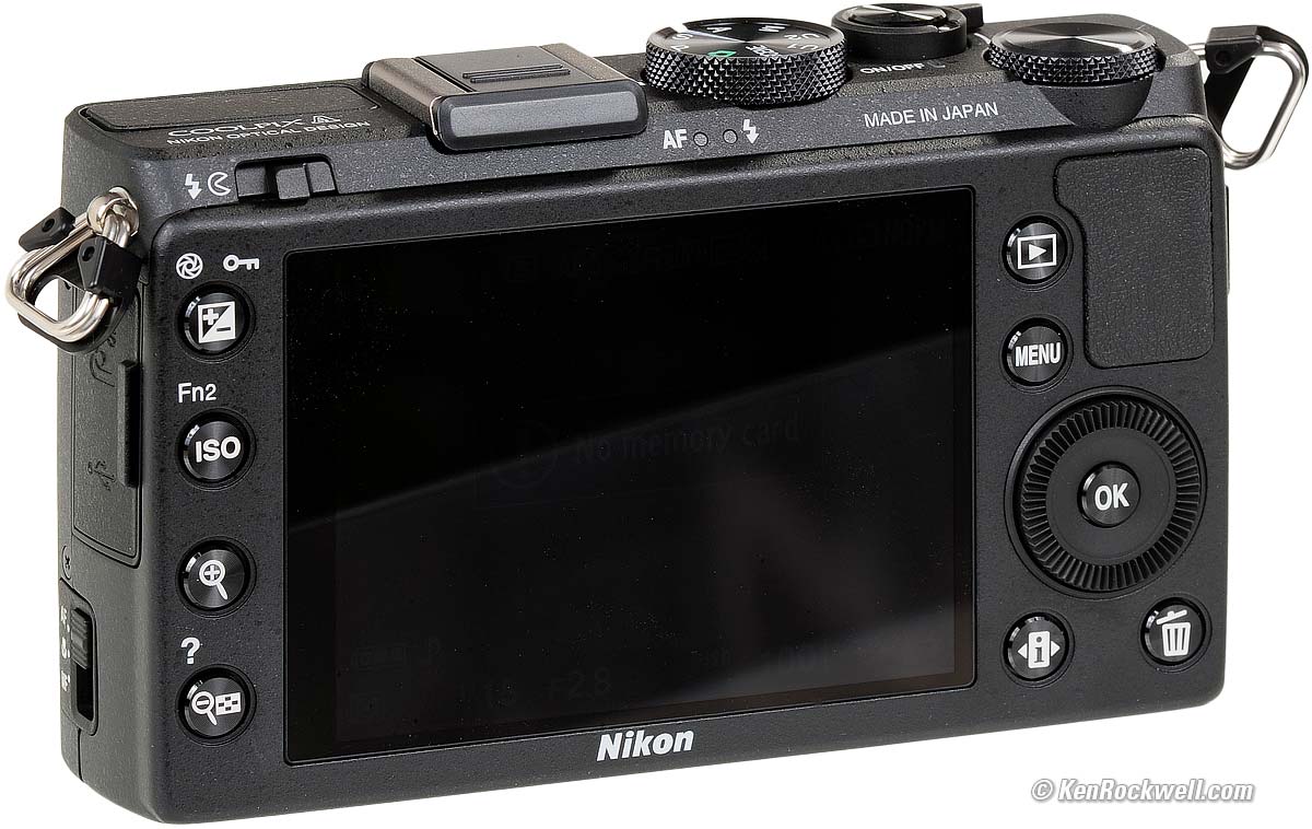 Home Donate New Search Gallery Reviews How-To Books Links Workshops About Contact Nikon Coolpix A Intro Specs Performance Compared Usage Recommendations More Nikon Coolpix A (10.5 oz./298 g. with battery and SD card, comes in black or silver, 16 MP DX sensor, 18.5mm f/2.8 (28mm equiv.) fixed lens, about $1,100). enlarge. I got mine at Adorama; Amazon is also a great place to get it. My biggest source of support for this free website is when you use those or any of these links when you get anything, regardless of the country in which you live — but I receive nothing for my efforts if you buy elsewhere. I'm not NPR; I get no government hand-outs and run no pledge drives to support my research, so please always use any of these links for the best prices and service whenever you get anything. Thanks for helping me help you! Ken. Rear, Nikon Coolpix A. enlarge.