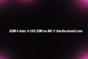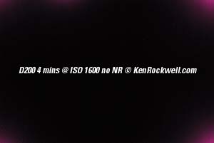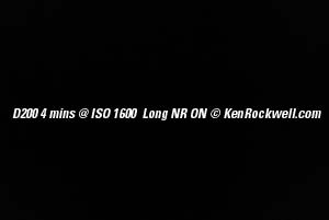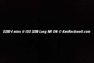 Orion by Moonlight. I bought mine from Ritz here. I bought another D200 from Adorama here. Also try Amazon here. Adorama usually has D200/18-70 kits in stock here. It helps me keep adding to this site when you click these links to get yours. See also my D200 Time Exposure page General This is a completely different topic than the noise and grain seen on my noise page. My D200 is spectacular for ridiculously long night exposures. Long exposure noise reduction (NR) lets the camera make a second identical exposure with the shutter closed. This lets the camera know exactly which pixels are hot and exactly how much fog (leakage) there is. The camera then subtracts the dark frame image from the shot you just made and saves the result. Engineers call this Dark Frame Subtraction. Dark frame subtraction unfogs the image and eliminates hot (lit) pixels. It doesn't reduce the grain. Even when set to ON it doesn't activate until exposures are 10s or longer. It does reduce the shot buffer from 25 to 11 JPGs regardless of shutter speed, so check this if your shot buffer just shrunk. My D70 and D1H always fogged one edge very slightly purple from charge leakage if you made a 30 second exposure at ISO 1600. The Long Exposure NR setting would fix this, but takes as much longer again as the exposure time to correct. Good news: My D200 has much less, if any, purple haze. I see no reason to use the Long Exposure NR even if you are photographing coal mines. Long Exposure NR is a pain. The second dark exposure is as long as the main exposure. That means you have to wait an extra four minutes after making a four minute exposure if you set LONG EXP NR ON. Further down I'm going to show you what happens in extreme examples of long exposures at high ISOs. Please note that only crazy people will ever do this. My shot of the stars above was made at LV -2.3, or six stops less than the first dark fog examples. I didn't bother with Long Exposure NR and left it OFF, its default. The last dark examples at four minutes are more ten stops more exposure than needed to shoot a landscape under the full moon. California