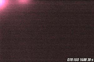 These are actual shots. Pretty boring! There is a very slight purple haze in the upper left of the D70 shot. The D200 looks better. Since you can't see anything here I'll lighten them both for you. I did this by dragging the right highlight slider in PhotoShop's Level tool from 255 all the way over to 32 for both images. This is equivalent to lightening these images by four stops, or LV -12. A few more stops would let you expose a barren landscape lit by nothing but starlight.