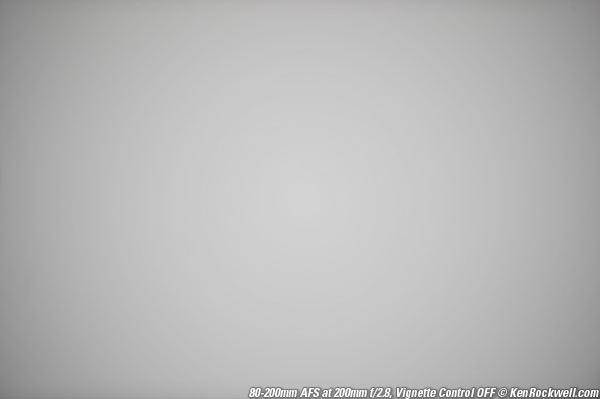 Vignette Control (VC) top Nikon added this feature in April 2008. You turn it on in MENU > Shooting > Vignette control. It defaults to OFF, and you also may set it to Normal, Low or High. It doesn't seem to do anything with blank test fields. I tried it with my 14mm f/2.8 AF-D, which has a load of falloff at f.2.8, and saw no improvement. Then I tried it with my 80-200mm f/2.8 AF-S, which has a decent amount of falloff at 200mm and f/2.8, and saw no improvement with test fields. Roll mouse over to see effect of Vignette Control with a gray field. All I see is a normal variation in exposure, but no rectification of corner darkening. This is with VC set to Normal. I didn't see any difference at High either. VC is not shown in any playback menu, as are ADR and other options. I also see no difference with real photos.