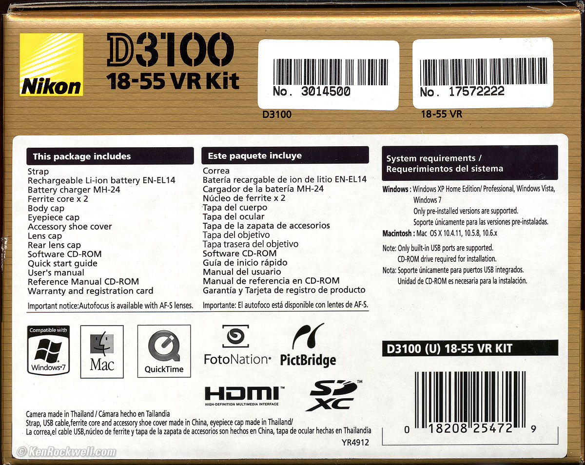 Price top April, 2014: New for $400 or refurbished for $349, each including lens. The D3100 only comes sold with Nikon lenses. It isn't sold body-only, and is offered with various lens options. In 2010, there were two options: the D3100 with a great 18-55mm VR lens for $699.95, and the same thing with an additional great 55-200mm VR lens for $949.95. The kit with 18-55mm VR sold for about $640 in 2010-2011, and was down to $547 the day before the D3200 was anounced. Boxed Nikon D3100. enlarge.