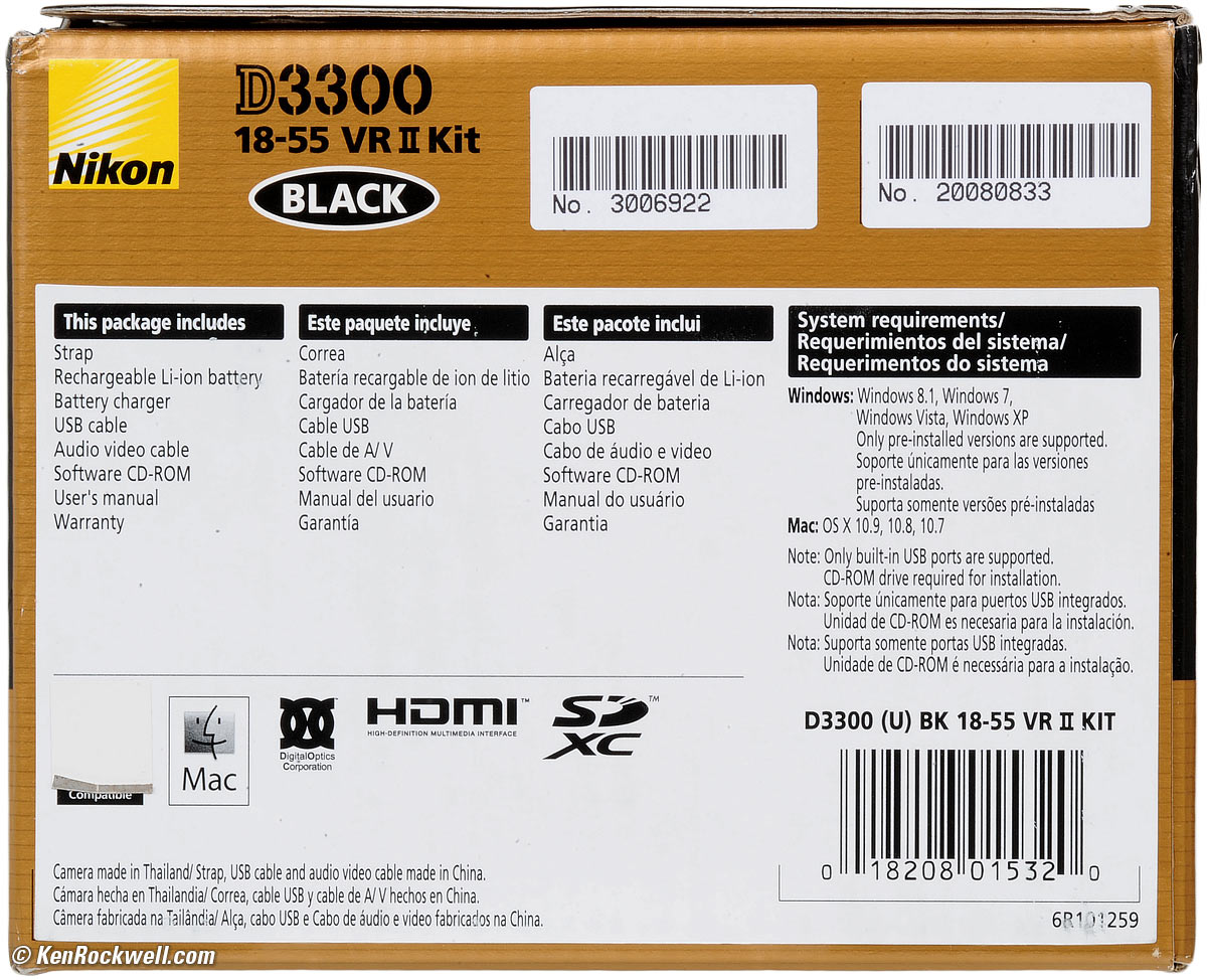 Getting a legal USA Version (applies in USA only) top In the USA, be sure your box has a "(U)" after "D3300" above the UPC bar code on the lower right. If it's another letter, you got ripped off with a gray market version from another country. That's why I never buy anyplace other than from my Approved Sources. You just can't take the chance of buying elsewhere, like at retail, because non-USA versions have no warranty in the USA, and you won't even be able to get new firmware or service for it — even if you're willing to pay out-of-pocket for it when you need it! Always be sure to check your box while you can still return it, or just don't buy from unapproved sources, so you'll be able to have your camera serviced as or if needed.