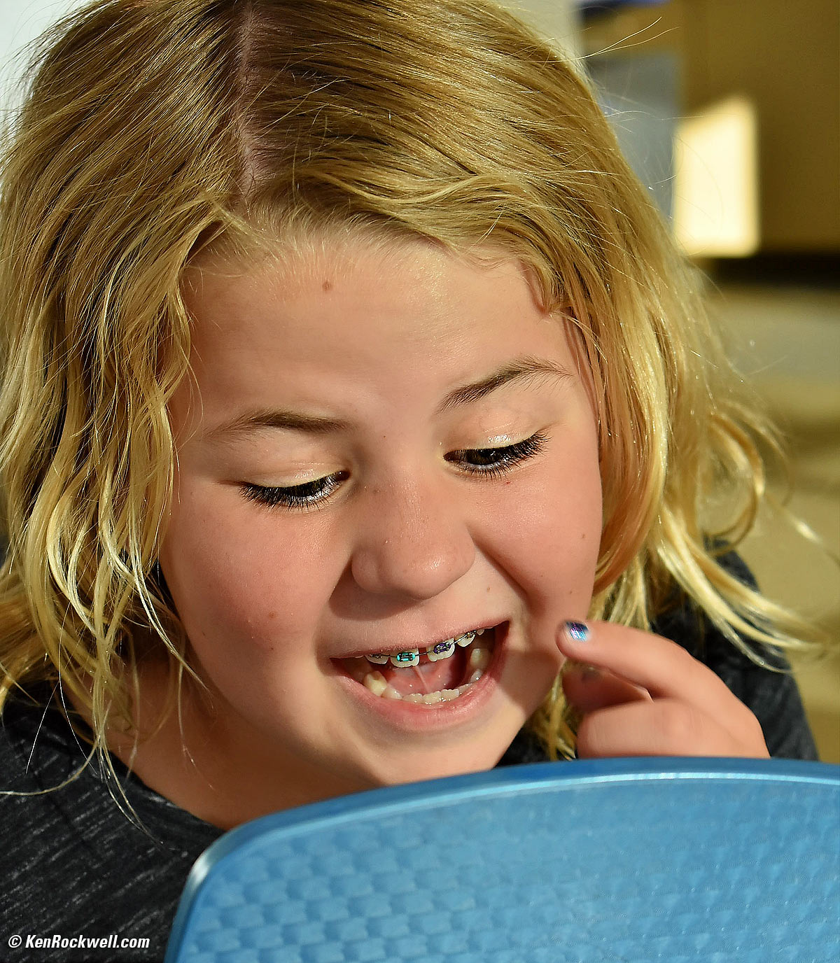 Katie checks out her new braces, March 2017. Nikon D3400, Nikon 18-55mm VR AFP at 55mm at f/5.6 at 1/100 at Auto ISO 560, Perfectly Clear. bigger.