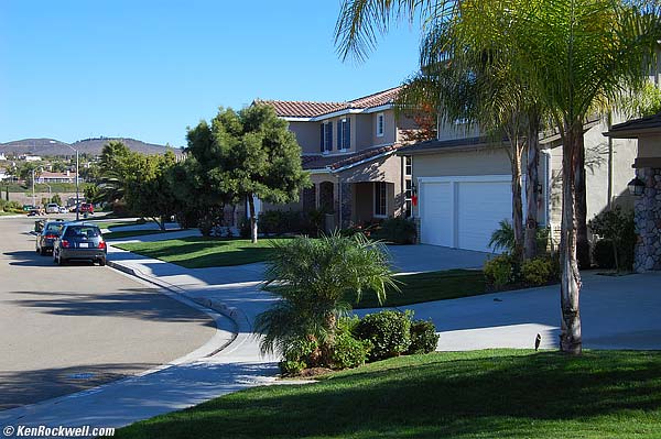 I love this thing as you read at the Introduction. Here are the details. Weightless! back to Performance. back to top. The first thing I noticed, and so did my non-photographer wife, is that it's so light. We all thought it would be much heavier, but no! It must be made of air. It's like not having a camera with you at all. The light weight makes it a dream to carry around all day. I also find the D40 lets me get make great results hand-held at slow speeds, probably because it also has very, very little vibration as the shutter fires. Fantastic Screen back to Performance. back to top. The second obvious WOW! is the big, bright, sharp, contrasty and almost three-dimensional LCD screen. It looks the same regardless of the angle from which you view it. It's the same vivid, accurate screen as on my D80, which I think is the same thing as my D200. I don't know about you, but I use my LCD all day to set exact exposure and white balance, and this LCD is just about as accurate and is as bright as my calibrated 30" Apple Cinema Display which cost me $2,500 earlier this year. Next week I hope to stick my color meter on it to see for sure. It makes my Canon 5D look dim and pathetic by comparison. My D40's LCD is bright! It's almost blinding at night, a far cry from the dim Canon DSLR LCDs I've been staring at all week. On the D40, what you see is what you get. The menus and images look awesome! Great Shots back to Performance. back to top. Image quality is great. It's the same as the D70/D50, but with a much bigger and better LCD on which to view them while shooting. Color back to Performance. back to top.Here's a shot from December 6th, 2006: Tree, D40, 18-200mm at 200mm, f/11 at 1/160, program -0.7 stops. I have my secrets to getting these colors, which is looking for colorful things then snapping a picture. Other secrets are to set my D40 to + saturation, -0.7 exposure and auto everything else. Point and shoot! This is exactly what came from my D40, no cropping, no playing with colors or anything. Here's the 2MB camera-original JPG. Here's a drive-by shot. Colors and exposure all exactly as the came from my D40 at my usual settings (+ Saturation, -0.7 exposure, Auto -3 WB, basic JPG, everything else on default). I fixed the drive-by perspective in Photoshop CS2's lens distortion filter.