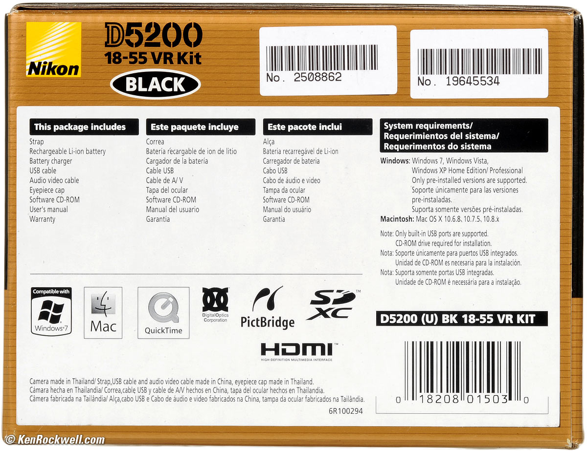 Included (body-only version) D5200 Body BS-1 Hot Shoe Cover BF-1B Body Cap DK-5 Eyepiece Cap DK-20 Rubber Eyecup AN-DC3 Strap EN-EL14 Battery MH-24 charger UC-E17 USB cable CP16 Audio video cable ViewNX 2 CD-ROM (don't waste your time). Box End, Nikon D5200 with 18-55mm lens. bigger.