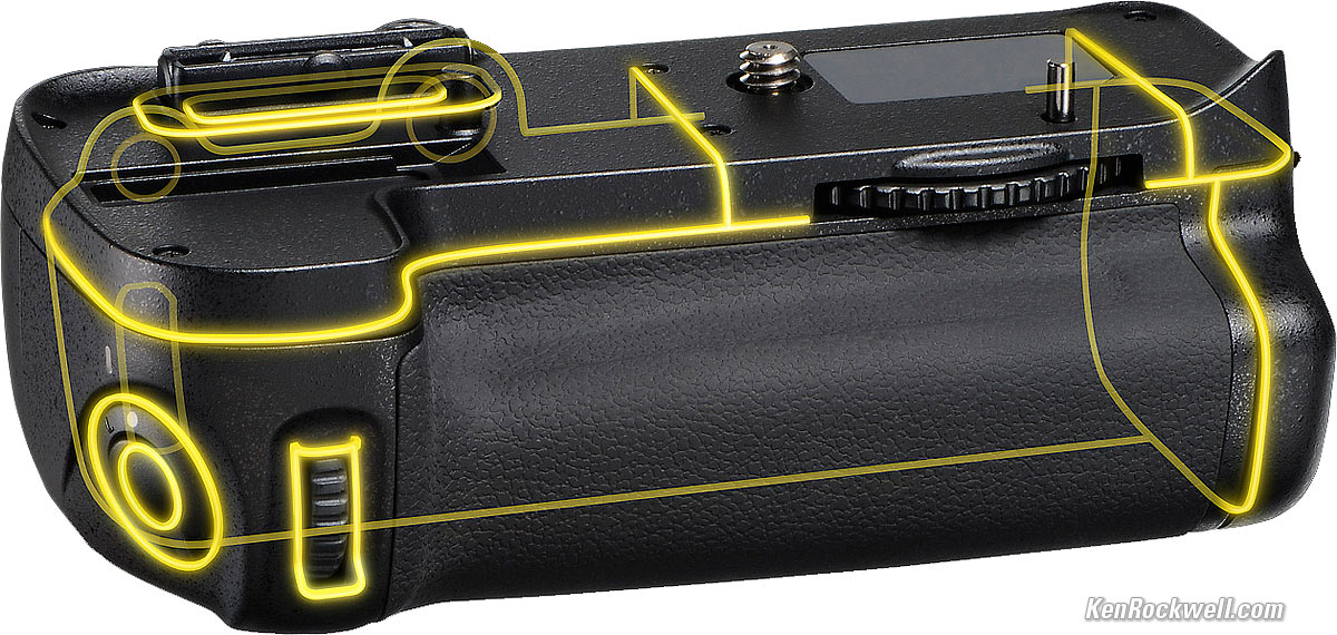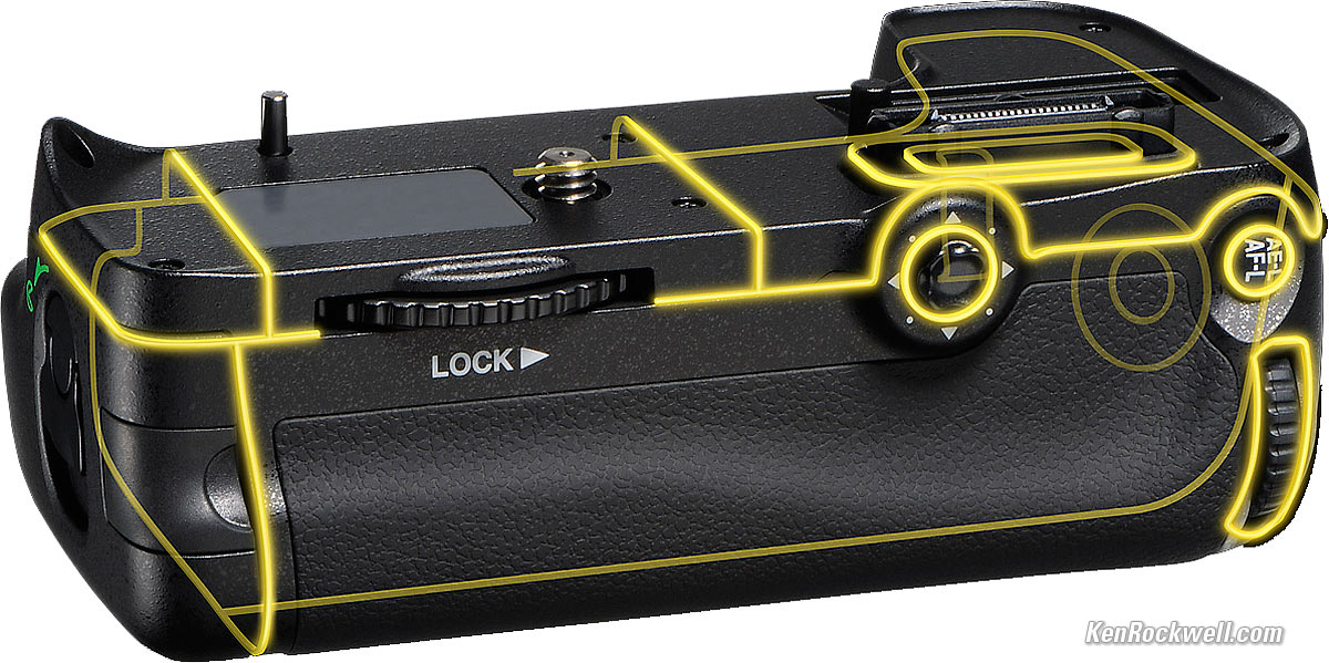 Optional Accessories top Nikon MB-D11, front, showing weather-sealing points. enlarge.