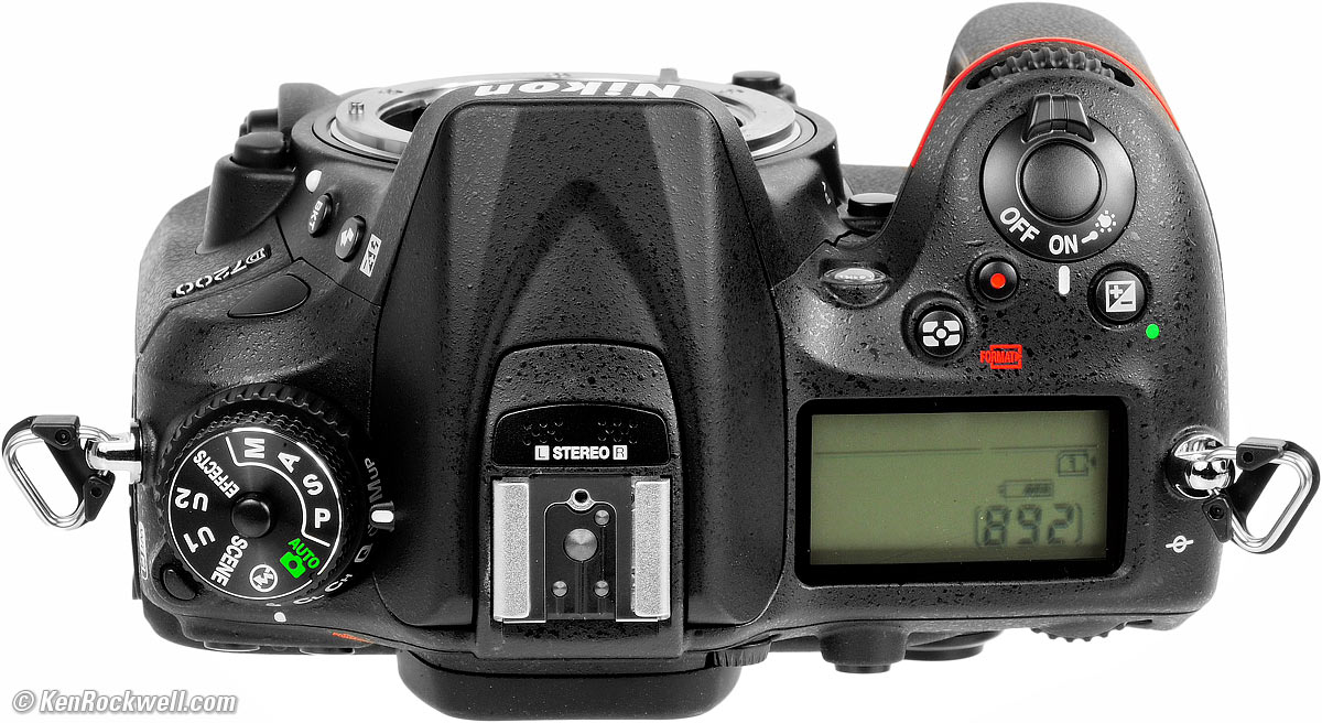 What's New top The D7200 is pretty much the same as 2013's D7100, which is a spectacular camera. Nikon claims a bigger buffer, but only if you shoot NEF or LARGE JPG. Both the D7100 and D7200 have 100-shot buffers for JPG BASIC or NORMAL shots, but for NEF, the D7200 can buffer about four times as many shots as the D7100. For LARGE JPG, the D7200 has a 100 frame buffer versus the 33 frames of the D7100. New is NFC Wi-Fi, but it only connects to your phone via an app. There's a new picture control option of Flat. There are now time-lapse movies. All the ISOs look great, so they are no longer locked out as Hi+1 etc. Now we just set the highest ISOs as any other ISO. The HDMI jack is now full-sized, same as those on Apple TVs, cable boxes and DVD players. The top LCD is now big, legible and simplified, instead of trying to cram too much information into a small space as the D7100 did. It has a green LED backlight.