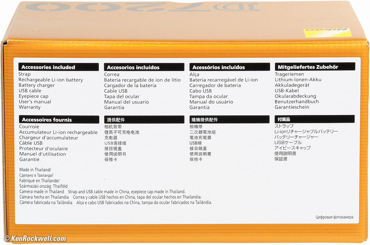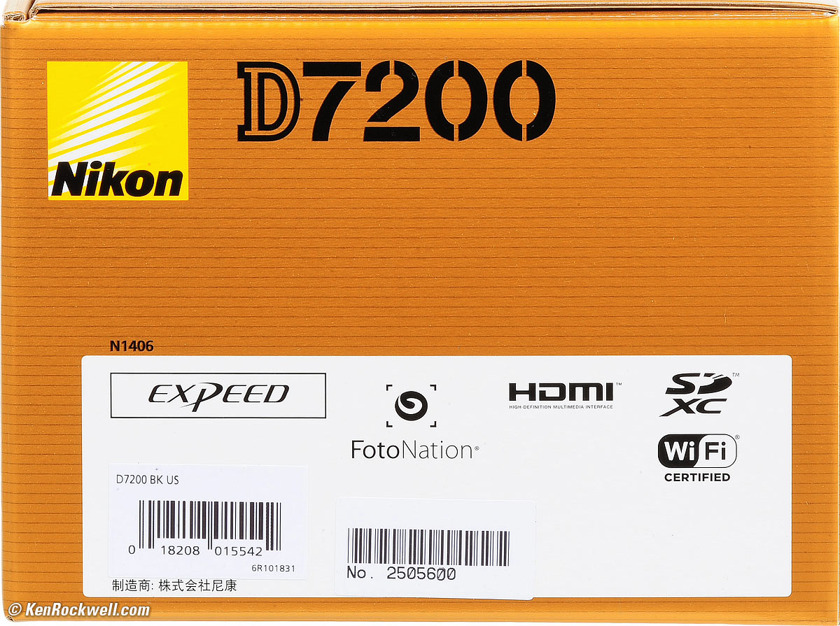 Getting a Legal USA Version (for USA only) Sample Images Intro Specifications Accessories USA Version Performance Compared Usage Recommendations More USA Nikon D7200 box end. bigger. In the USA, be sure your box has "US" after "D7200" and the color code ("BK" on this black one) above the UPC bar code on the lower left. If the letters are different, you got ripped off with a gray market version from another country. This is why I never buy anyplace other than from my personally approved sources. You just can't take the chance of buying elsewhere, especially at retail, because non-USA versions have no warranty in the USA, and you won't even be able to get new firmware or service for it — even if you're willing to pay out-of-pocket for it when you need it! Always be sure to check your box while you can still return it, or just don't buy from unapproved sources, so you'll be able to have your camera serviced and get free updated firmware as needed. Most importantly, the legal USA version has a gray warranty card from Nikon USA with the same serial number as your box and your camera, and there is a white "U - S" sticker on the plastic bag holding the manuals: USA Nikon D7200 box contents. bigger. The important part is the Nikon USA warranty paper, whose serial number must match the one on your camera. If you have that, don't get too bent out of shape if the sticker on the manuals says U-K or the box is a little different. If you've got a Nikon USA warranty card with a matching serial number, you're OK.